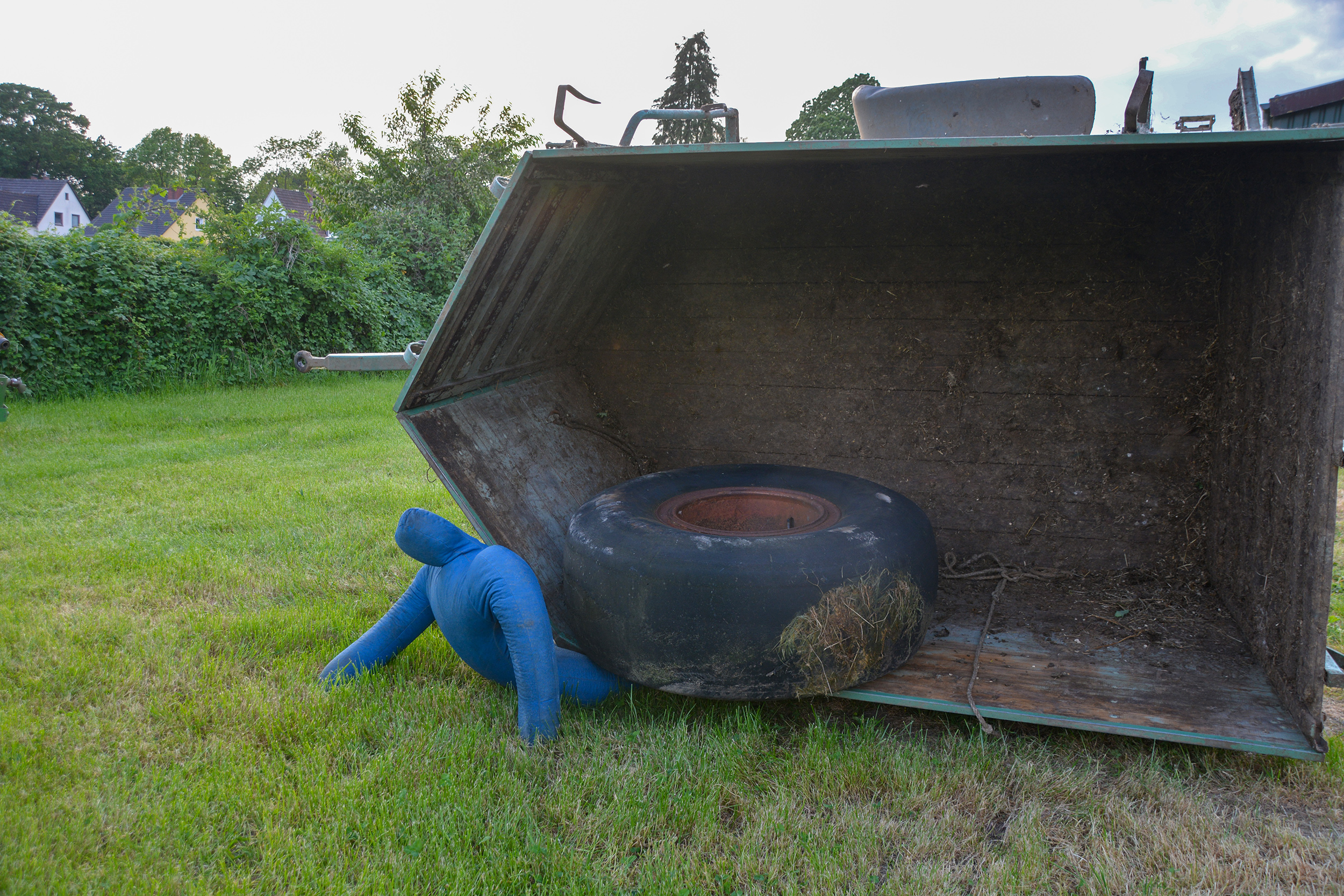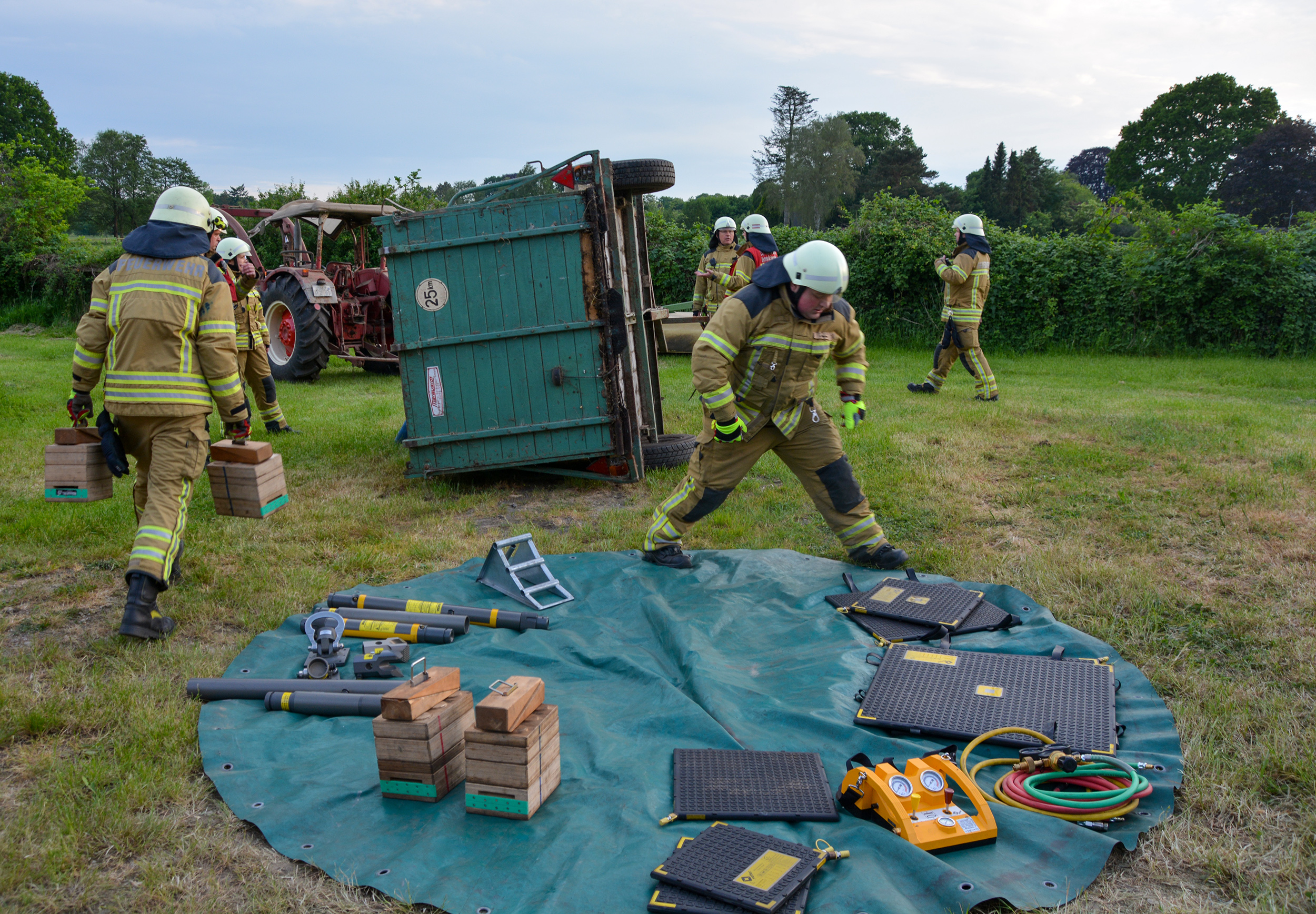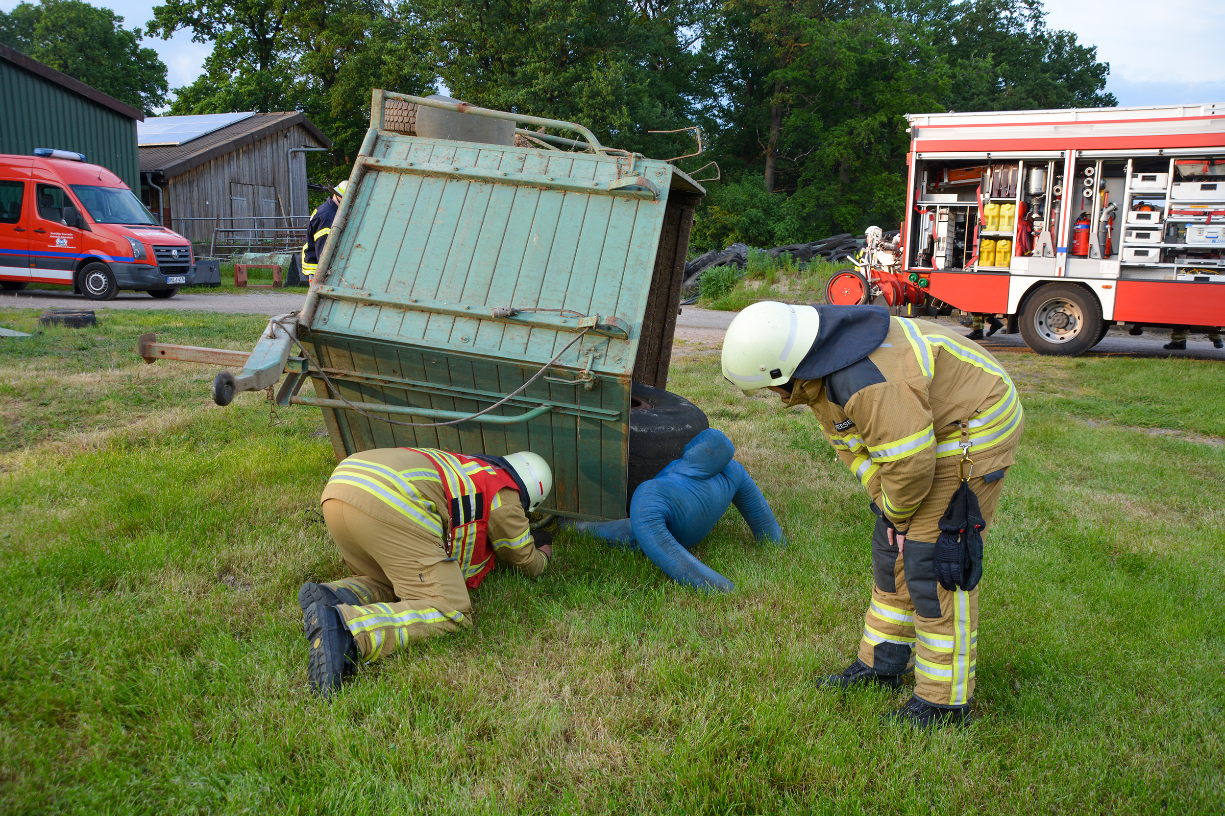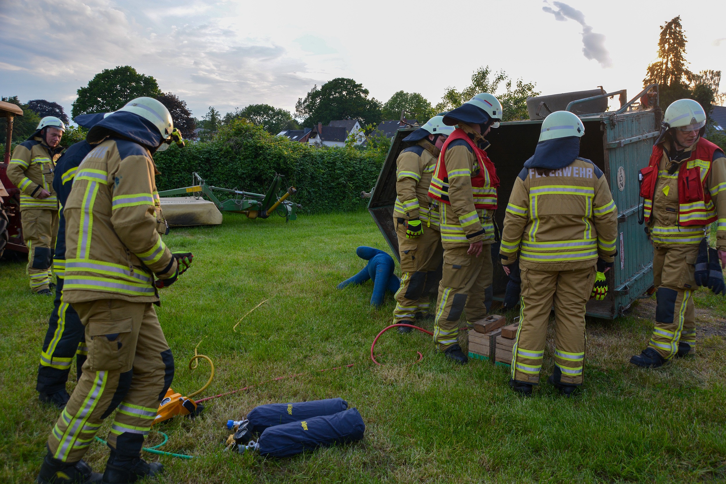Nach rund 25 Minuten hatten die fünf Trupps alle vermissten Personen aus der komplett vernebelten Halle gerettet. Im Anschluss nutzten die Trupps die Gelegenheit, bei klarer Sicht in der Halle die Suche nochmals Revue passieren zu lassen und mögliche Optimierungen zu besprechen. Währenddessen waren auch die Einsatzkräfte mit der technischen Rettung erfolgreich. Mittels eines Spreizers war der Anhänger leicht angehoben worden, um Hebekissen in Stellung zu bringen. Mit diesen konnte dann das Fahrzeug weiter angehoben und die Person befreit werden. Auch hier nutzten die Einsatzkräfte anschließend noch die Möglichkeit, alternative Rettungsansätze auszuprobieren.