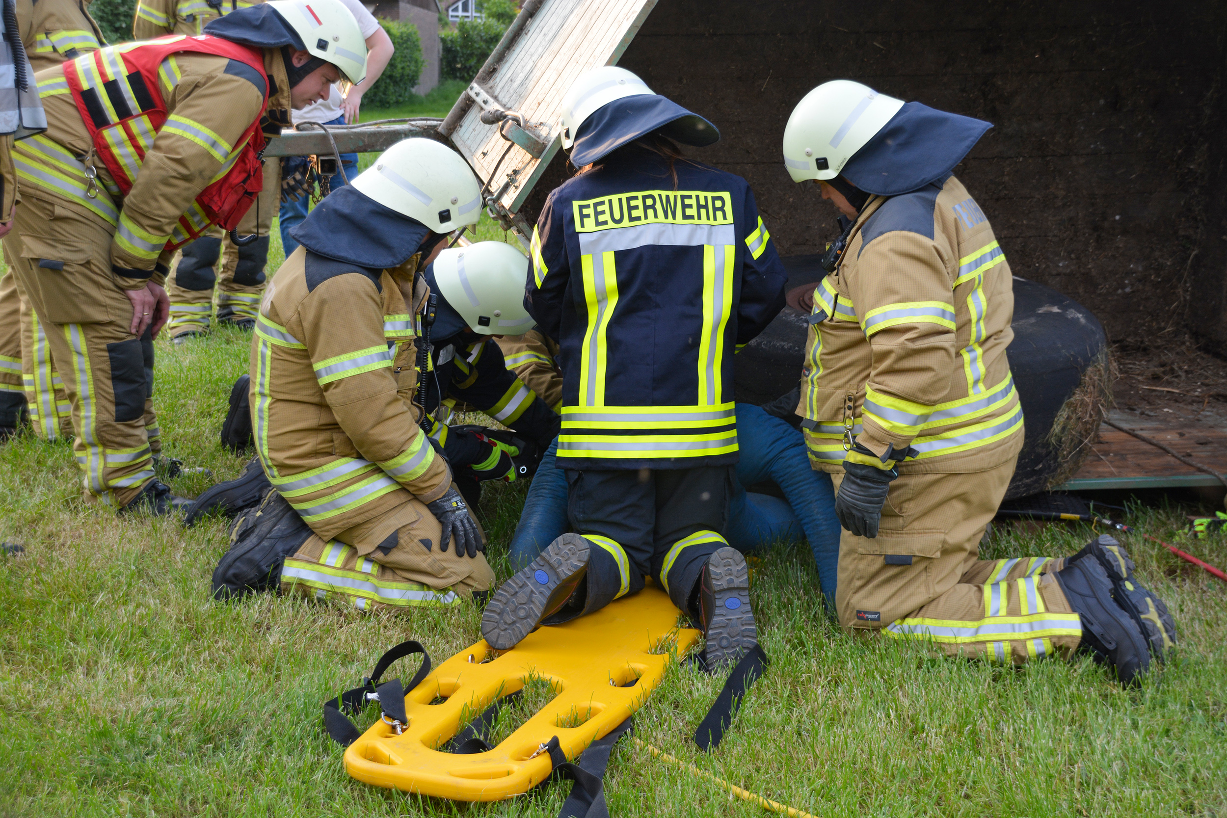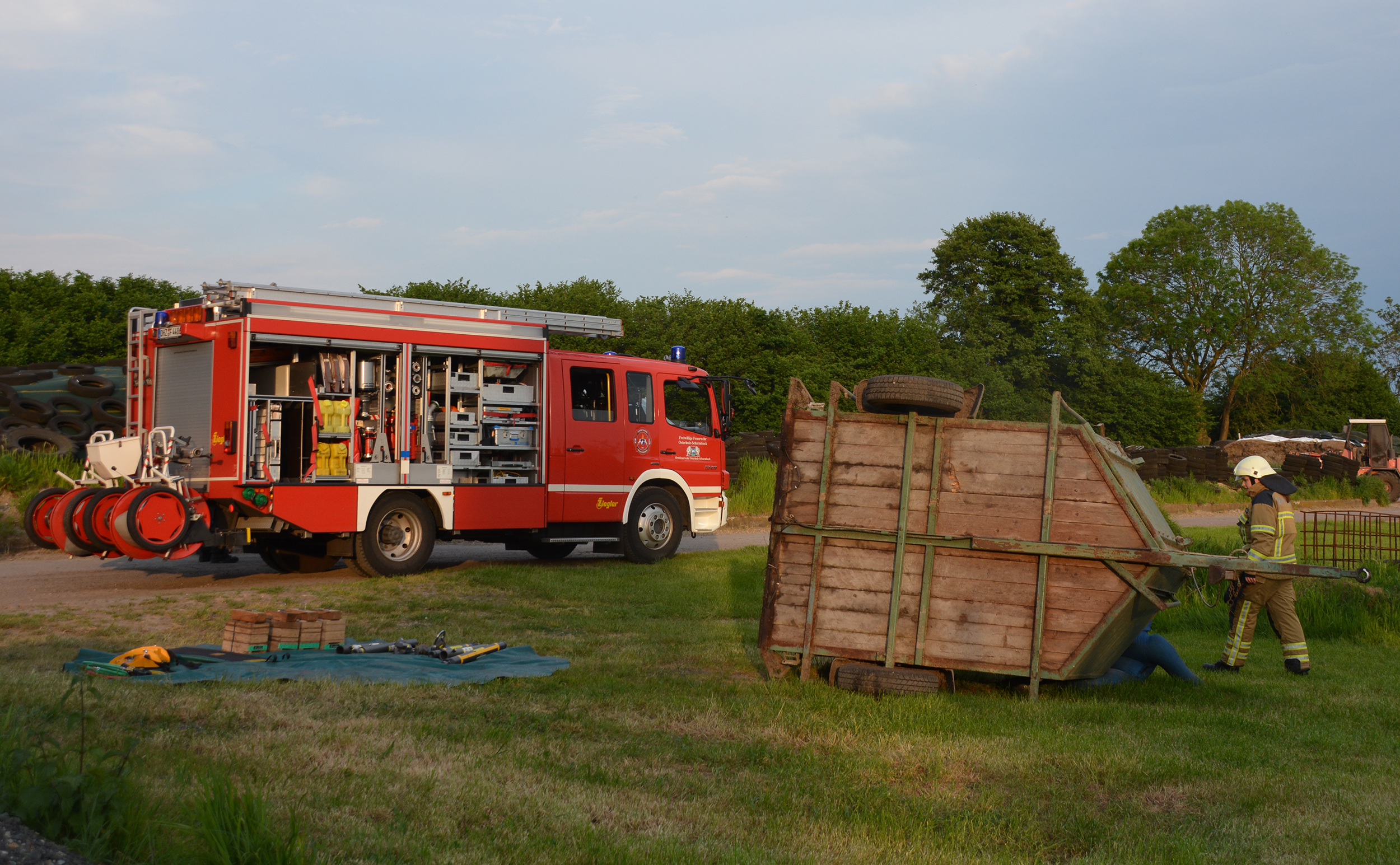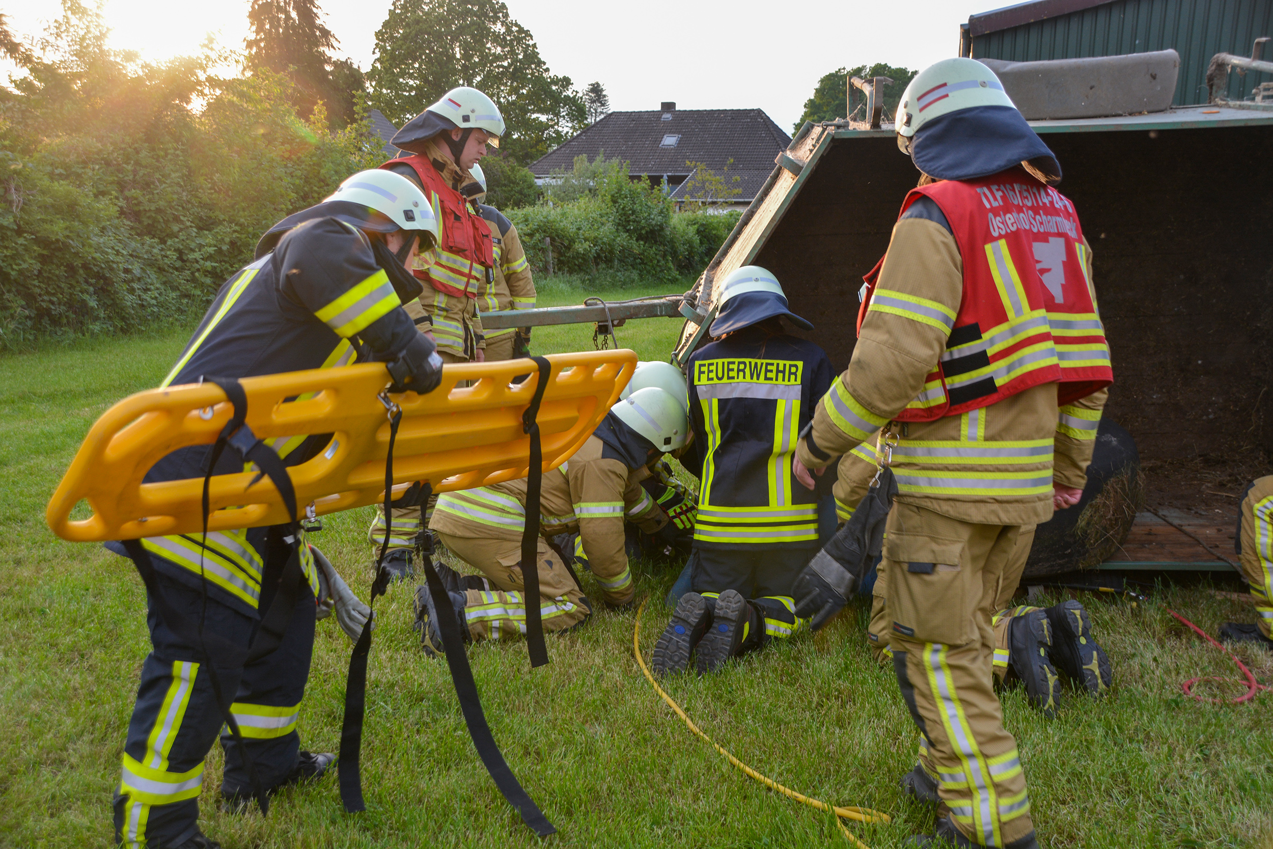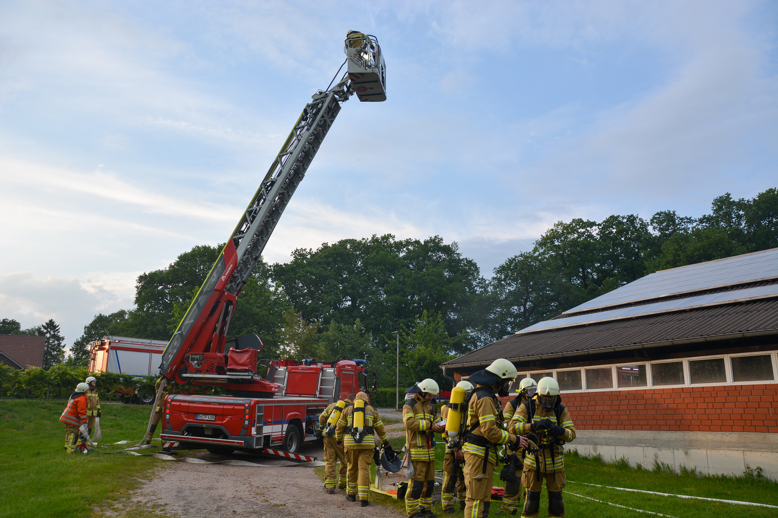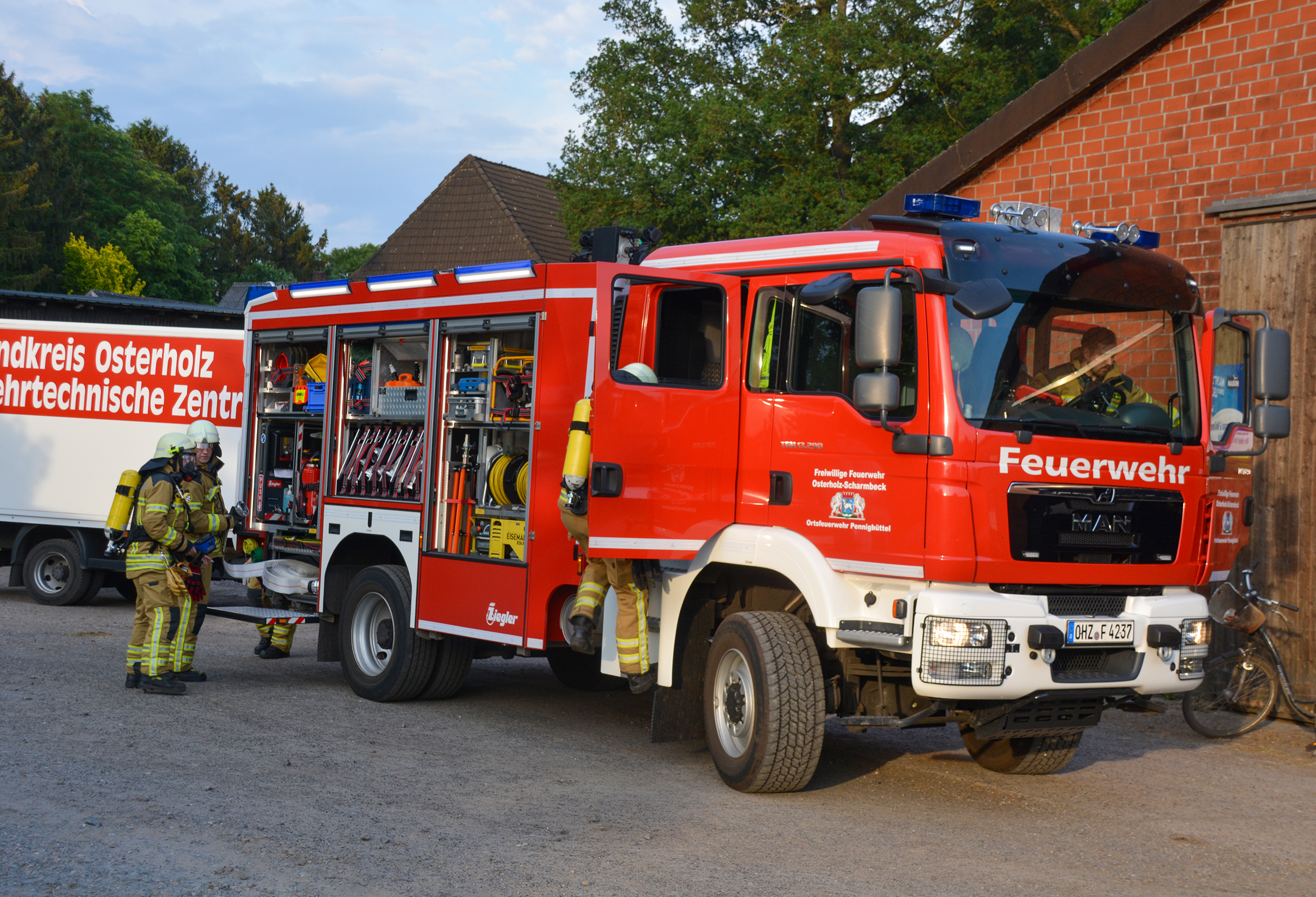 Ein Feuer in einem landwirtschaftlichen Gebäude mit sechs Vermissten war die Ausgangslage für die (stille) Alarmierung zu einer gemeinsamen Einsatzübung der Ortsfeuerwehren Osterholz-Scharmbeck und Pennigbüttel. Vor Ort berichtete der Eigentümer dem eintreffenden Einsatzleiter zudem, dass beim Versuch, schweres landwirtschaftliches Gerät aus der brennenden Halle in Sicherheit zu bringen, ein Anhänger umgestürzt war und eine Person darunter eingeklemmt worden war. Daraufhin wurden für beide Aufgaben separate Einsatzabschnitte gebildet: Die Atemschutztrupps aus Osterholz-Scharmbeck sowie die Drehleiter unterstützen die Einsatzkräfte aus Pennigbüttel bei der Brandbekämpfung und der Menschenrettung. Die verbliebenen Einsatzkräfte aus Osterholz-Scharmbeck übernahmen mit der Ausrüstung des Hilfeleistungslöschgruppenfahrzeuges die technische Rettung der eingeklemmten Person.