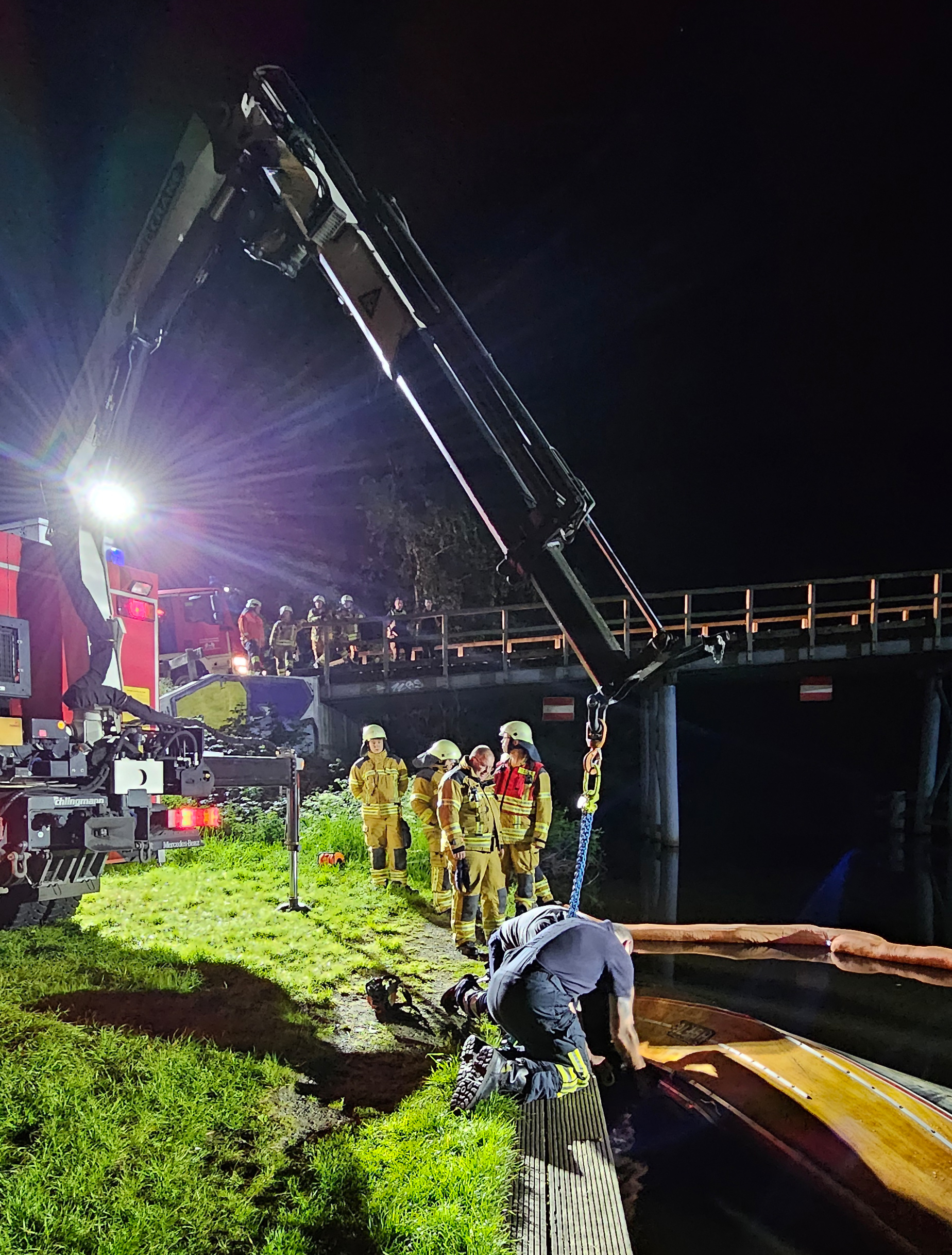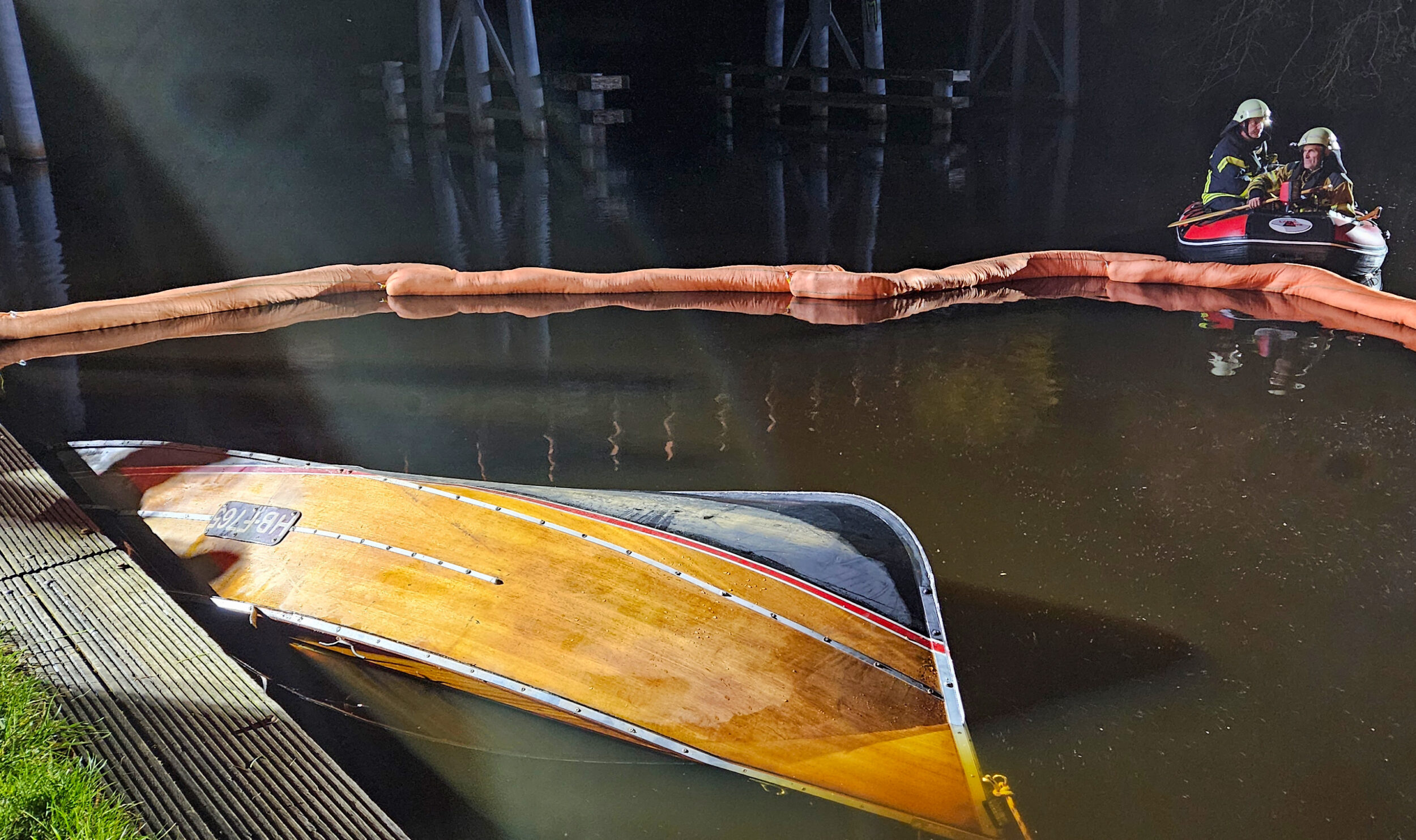 Ein sinkendes Boot auf der Hamme sorgte am Montagabend für einen gemeindeübergreifenden Einsatz von drei Ortsfeuerwehren. Um 22:05 Uhr wurde die Ortsfeuerwehr Ritterhude zu einem Austritt von Betriebsstoffen aufgrund eines sinkenden Bootes alarmiert. Eine Erkundung ergab, dass sich der Einsatzort nicht wie zunächst angenommen, an der Ritterhuder Schleuse befand, sondern an der Hammebrücke Scharmbeckstotel. Dort befand sich ein motorisiertes Holzboot weitestgehend unter Wasser.