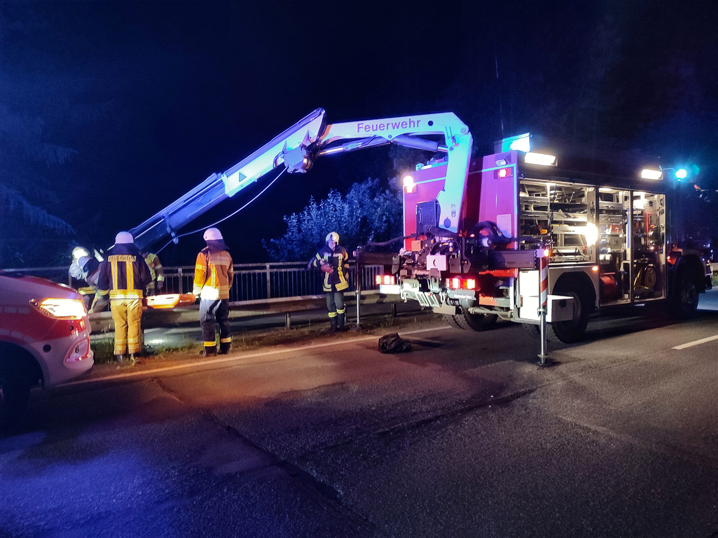 Nach dessen Eintreffen wurde die Person in Zusammenarbeit mit dem Rettungsdienst und Notarzt auf einer Schleifkorbtrage mittels Kran nach oben transportiert. Anschließend wurde die Person an den Rettungsdienst übergeben und die eingesetzten Mittel konnten zurückgebaut werden.