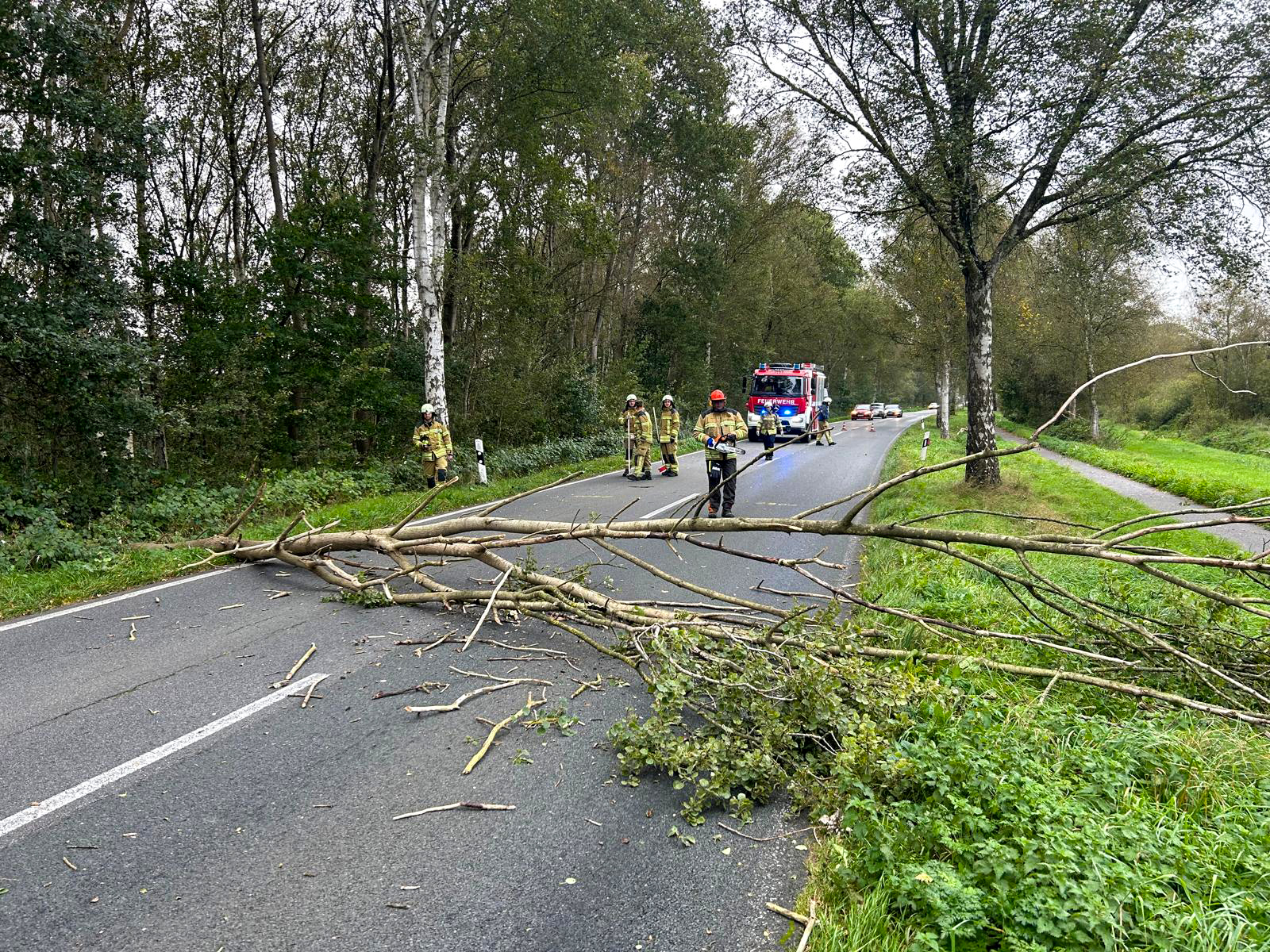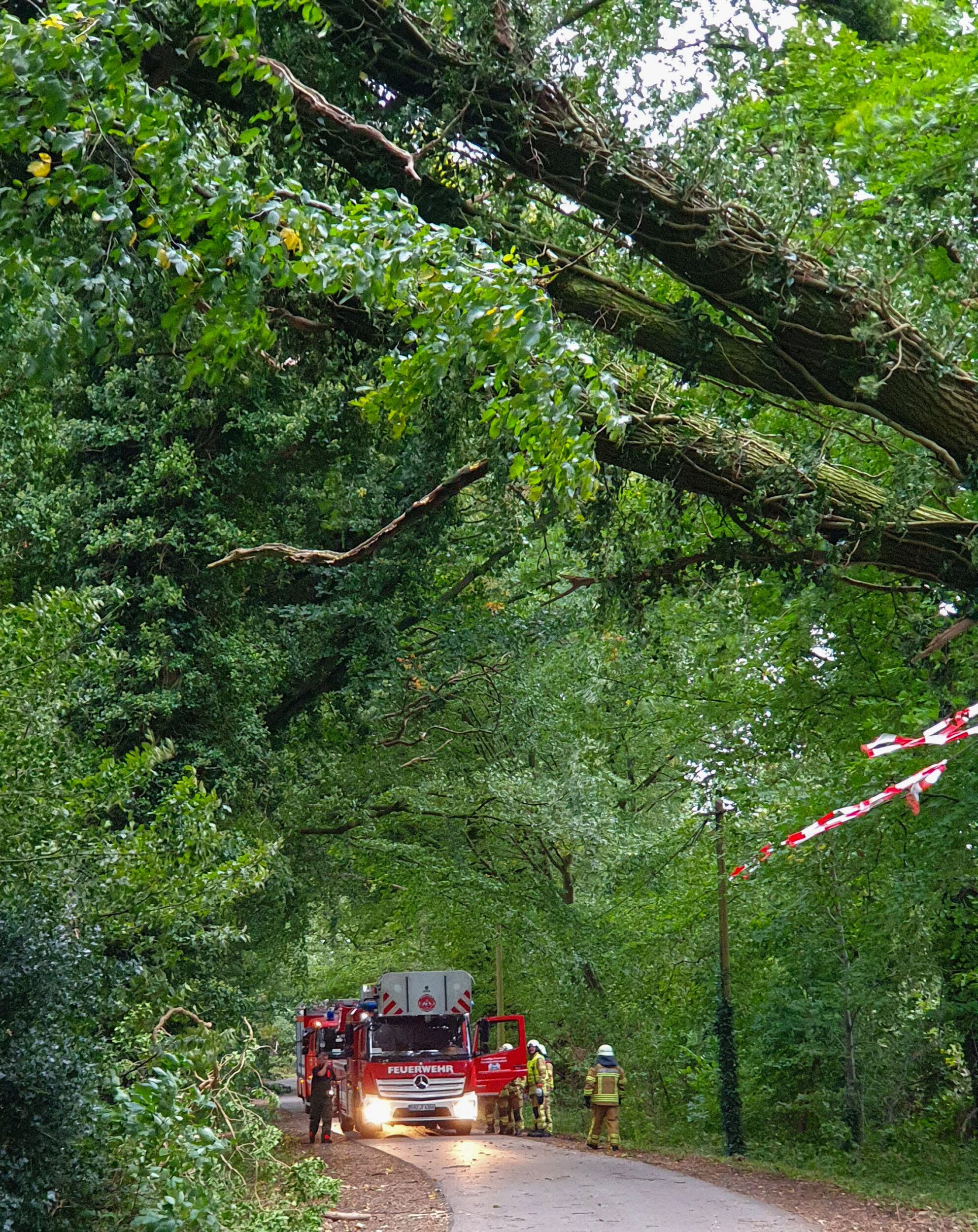 Zwischenzeitlich wurde um 17:26 die Ortsfeuerwehr Ohlenstedt in den Hamberger Weg gerufen. Dort hatte sich ein Baum geteilt und war in einen weiteren Baum gestürzt. Eine Telefonleitung war ebenfalls betroffen. Die nachalarmierte Drehleiter der Ortsfeuerwehr Osterholz-Scharmbeck konnte aufgrund der lokalen Gegebenheiten nicht zum Einsatz kommen. Daraufhin wurde eine Fachfirma angefordert, die die Beseitigung des Baumes übernahm. Die Ohlenstedter Kräfte sicherten den Bereich ab und leuchteten diesen aus. Zudem wurde ein weiterer beschädigter Baum in der benachbarten Straße Elenbruch beseitigt. Die Arbeiten an dieser Einsatzstelle waren nach rund zwei Stunden beendet.
