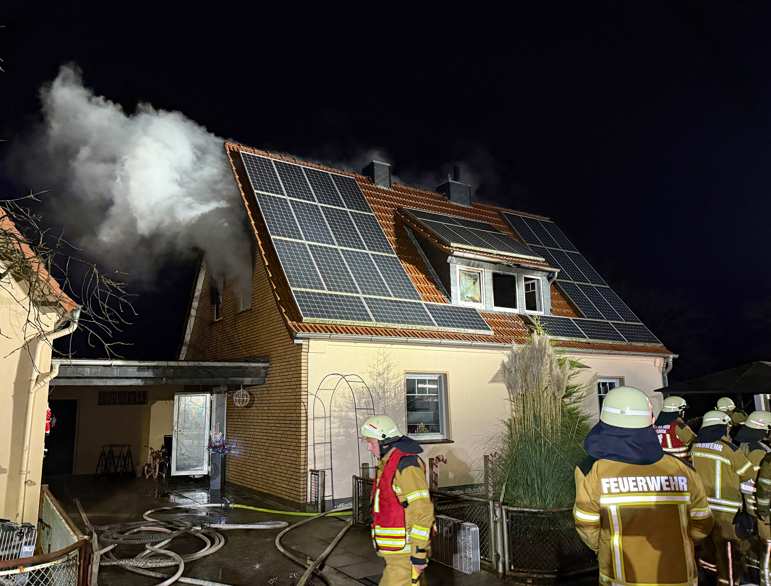Bei Eintreffen der ersten Kräfte aus Sandhausen stand das Obergeschoss des freistehenden Einfamilienhauses bereits in Vollbrand. Zu diesem Zeitpunkt hatten sich zwei Erwachsene und drei Kinder bereits eigenständig aus dem betroffenen Wohnbereich in Sicherheit bringen können. Die Feuerwehr ging unmittelbar mit drei Trupps zur Brandbekämpfung vor. Aufgrund der baulichen Situation vor Ort konnte die Drehleiter nicht eingesetzt werden.