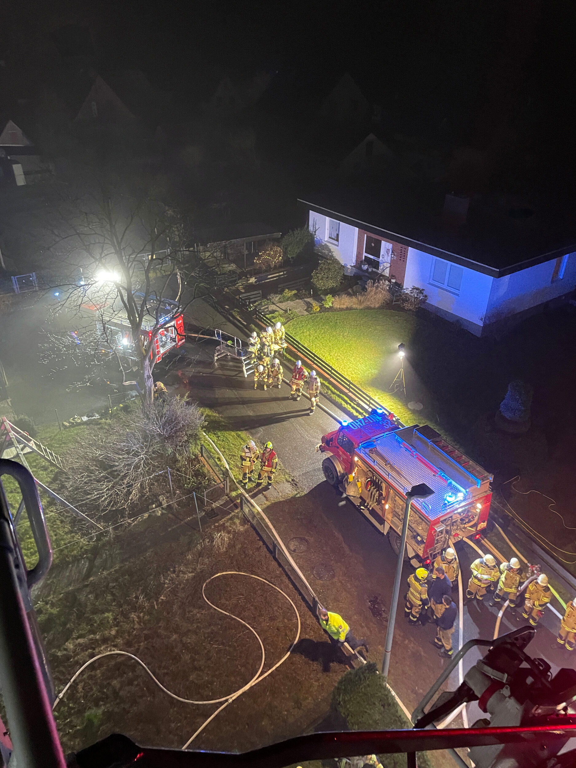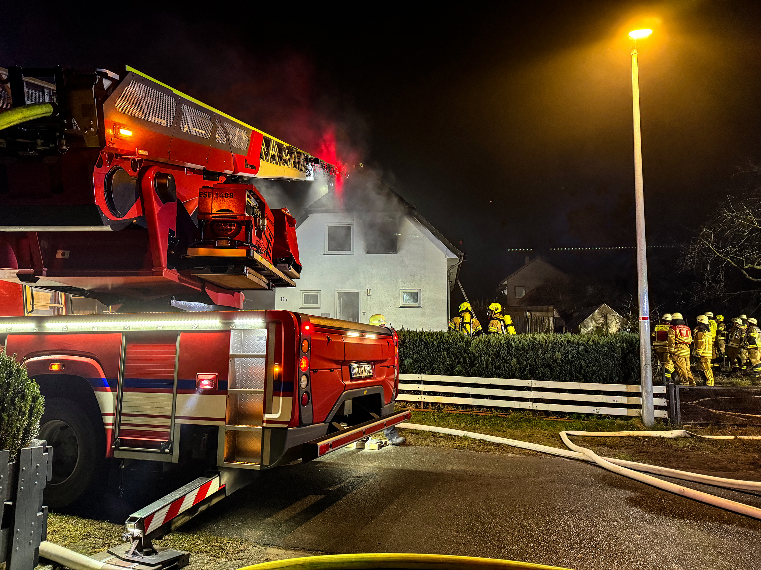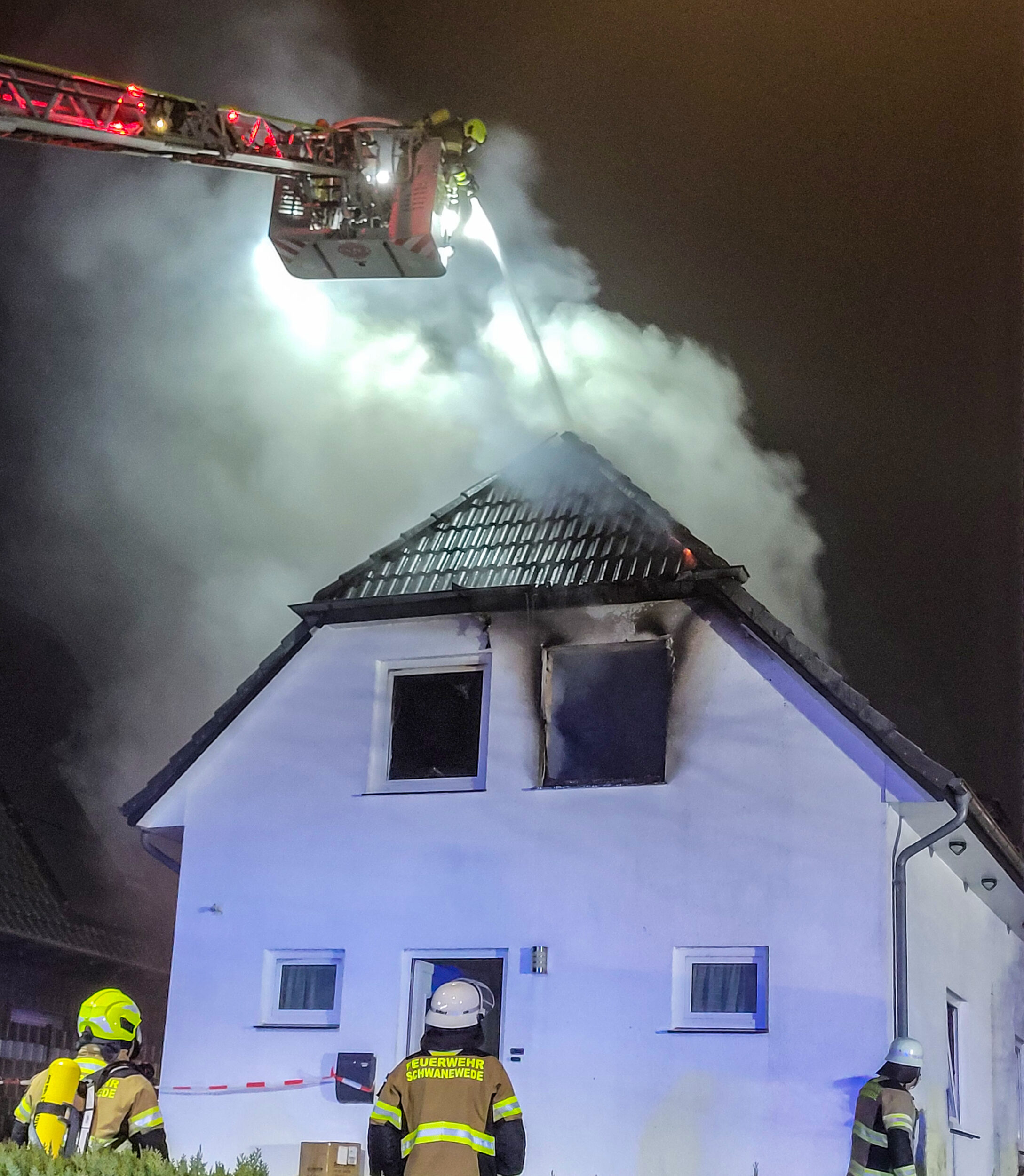 Zu einem Gebäudebrand in der Nachbargemeinde Schwanewede wurde am frühen Freitagmorgen die Drehleiter der Ortsfeuerwehr Osterholz-Scharmbeck alarmiert. Vor Ort unterstützte das Fahrzeug bei der Brandbekämpfung. Aus dem Korb heraus wurden zudem Teile der Dachhaut aufgenommen und Glutnester abgelöscht.