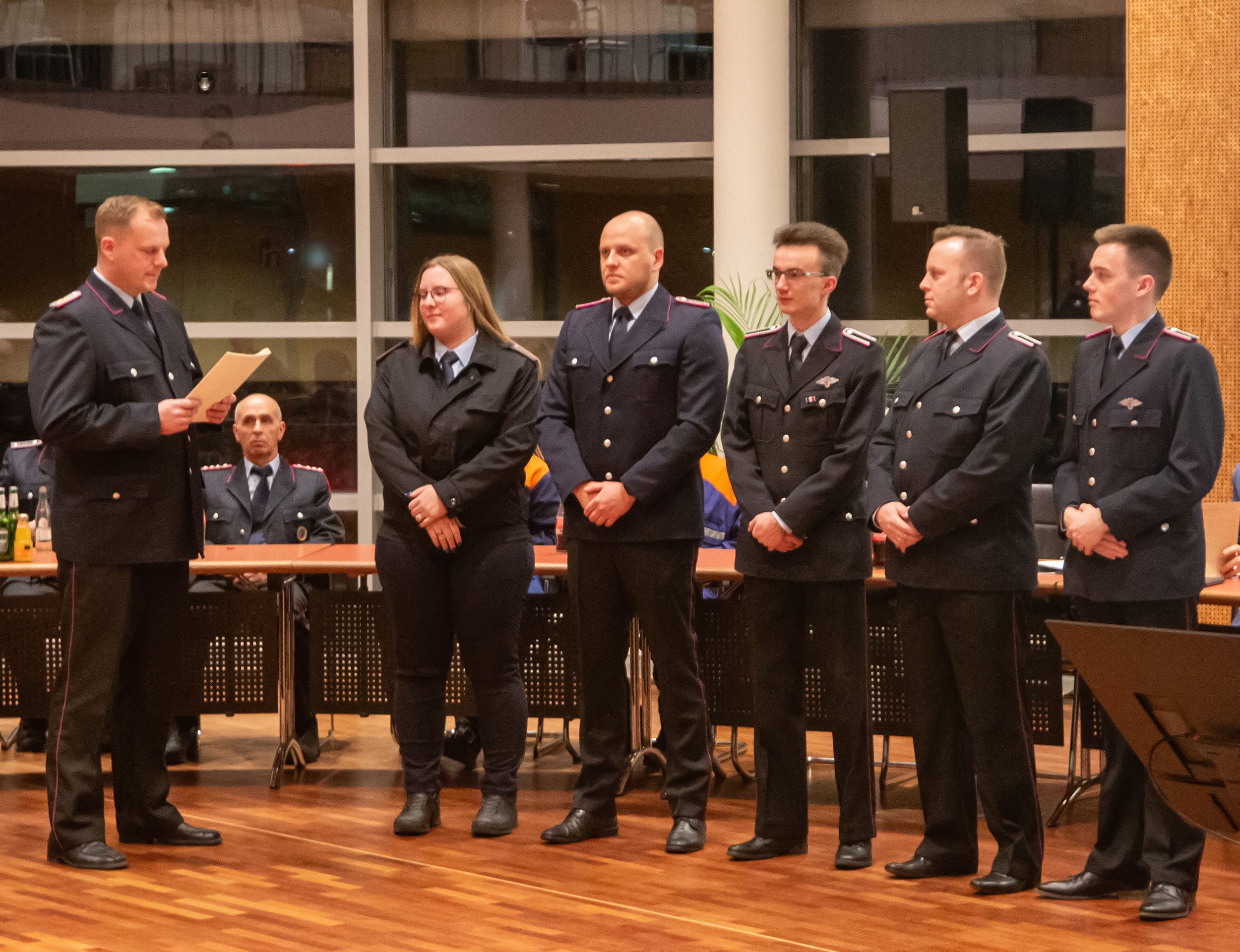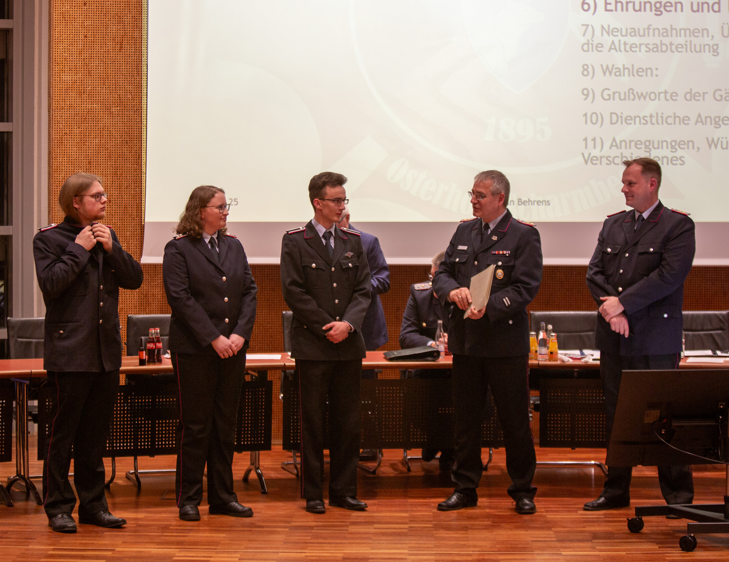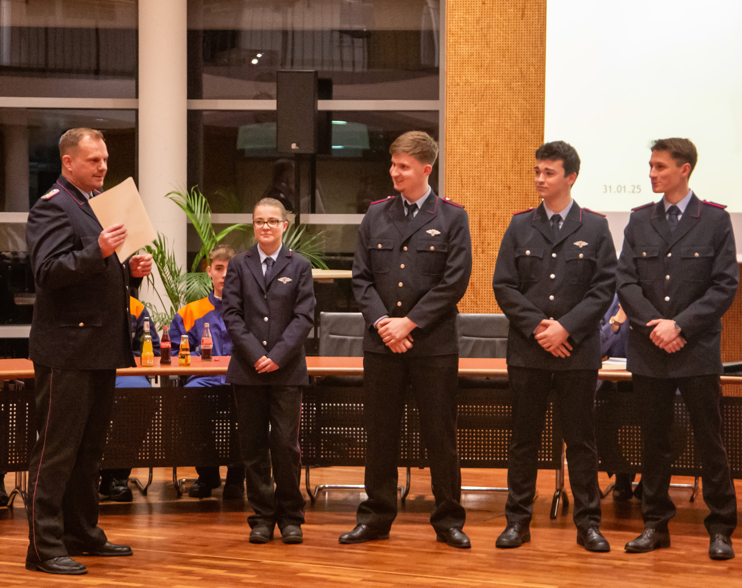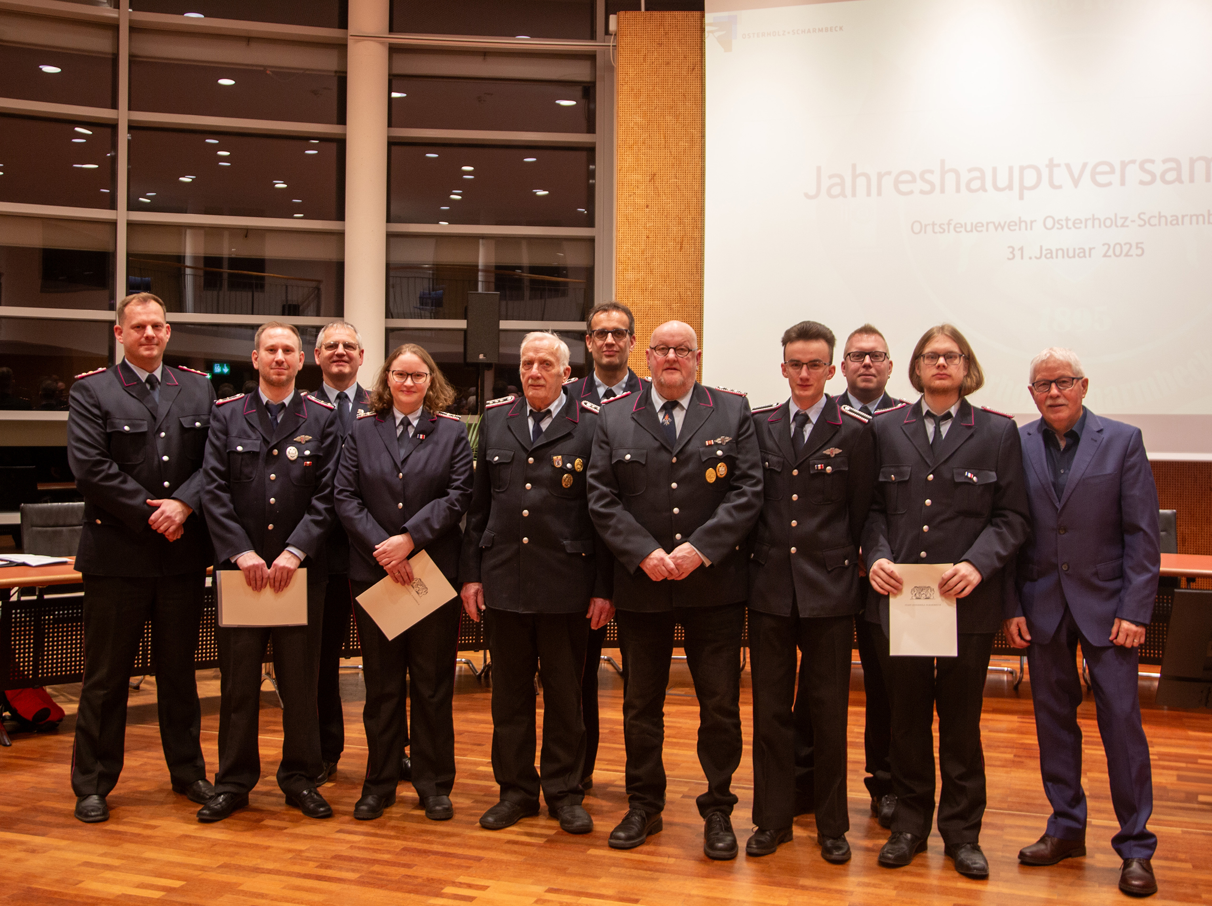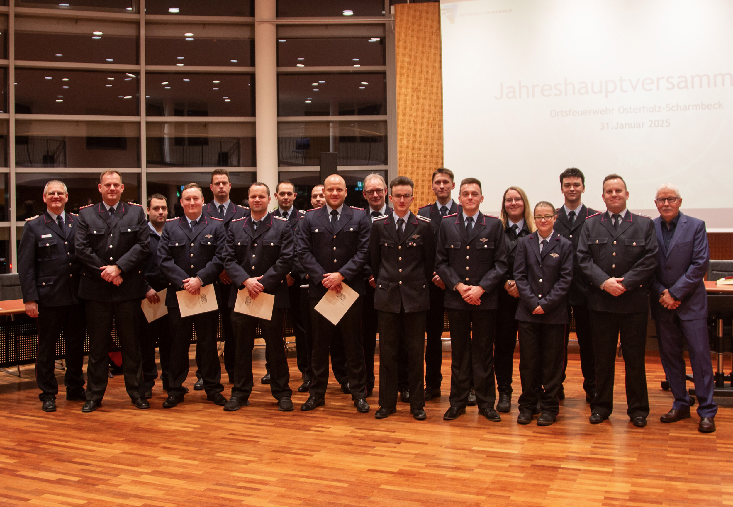 Befördert wurden: Daniel Hartmann, Jason Raschke, Arved Walpuski und Josephine Wulf (Feuerwehrmann/Feuerwehrfrau), Timm Freund, Kay Katenkamp, Majanka Recht, Jannik Soltner und Erich Steer (Oberfeuerwehrmann/Oberfeuerwehrfrau), Thimon Chuttek, Mailo Gruner und Hendrik Schumacher (Hauptfeuerwehrmann), Sascha Gerkens und Niklas Schilling (Löschmeister), Carsten Bredemeier (Oberlöschmeister), Cüneyt Yumusak (Brandmeister).