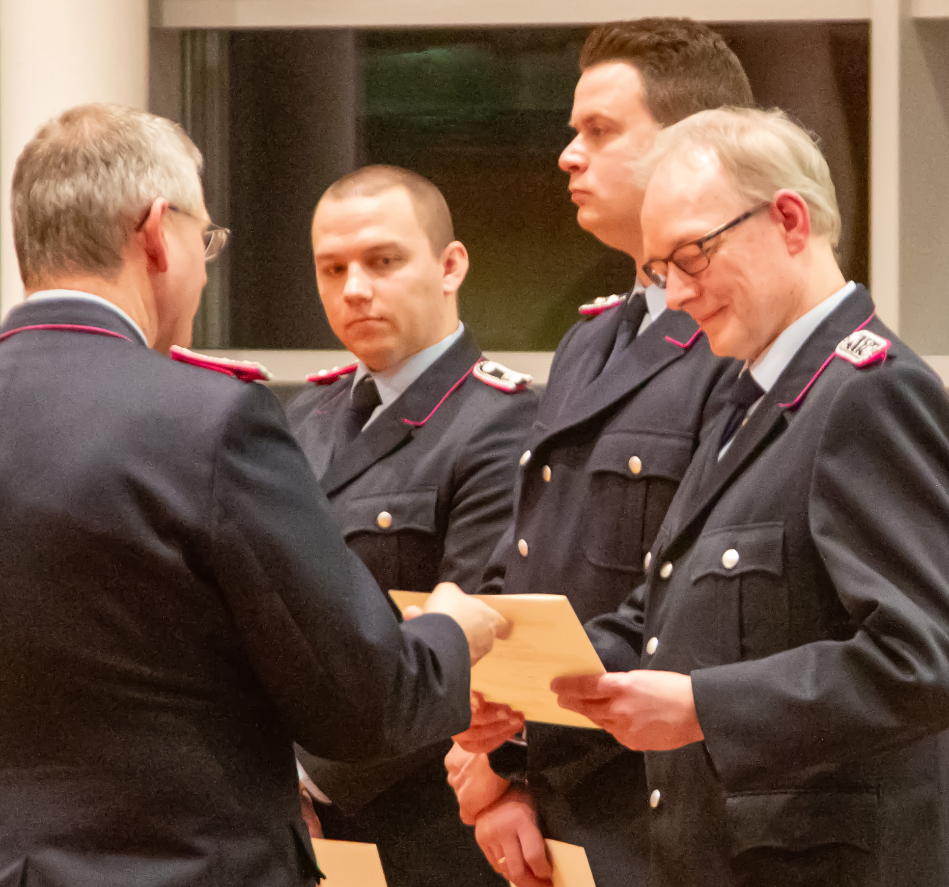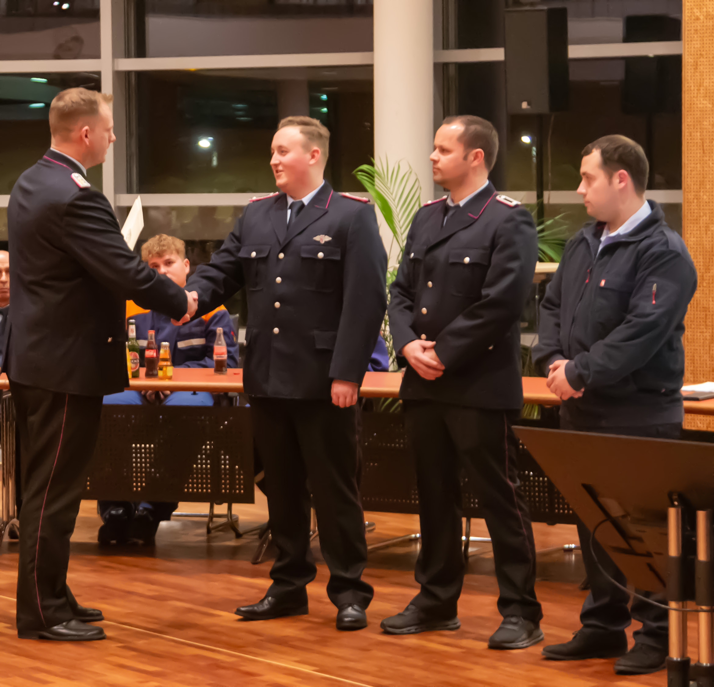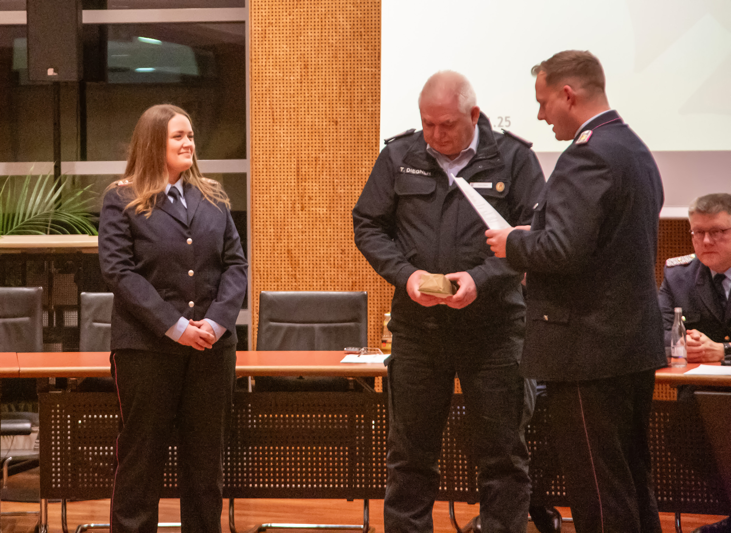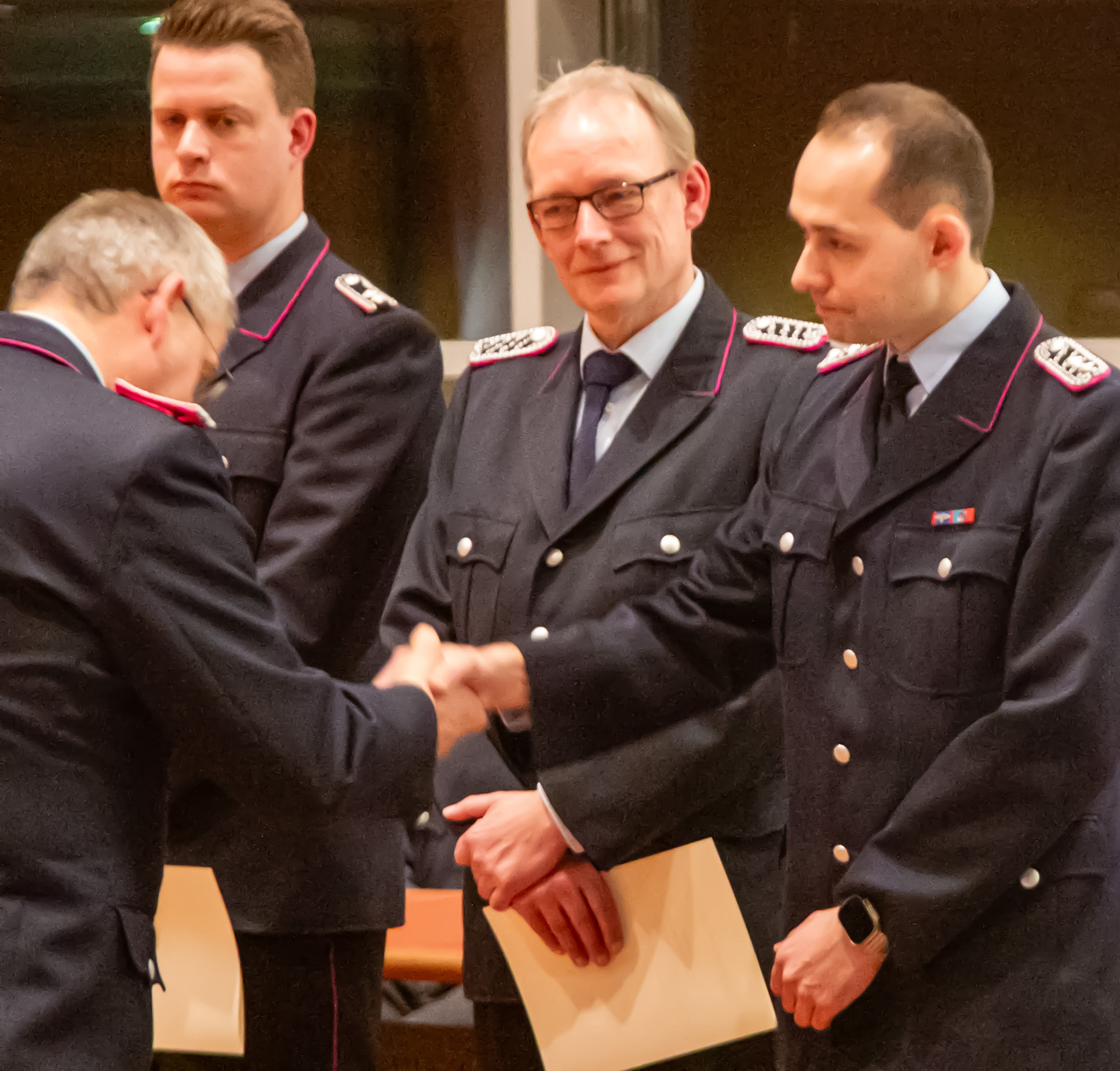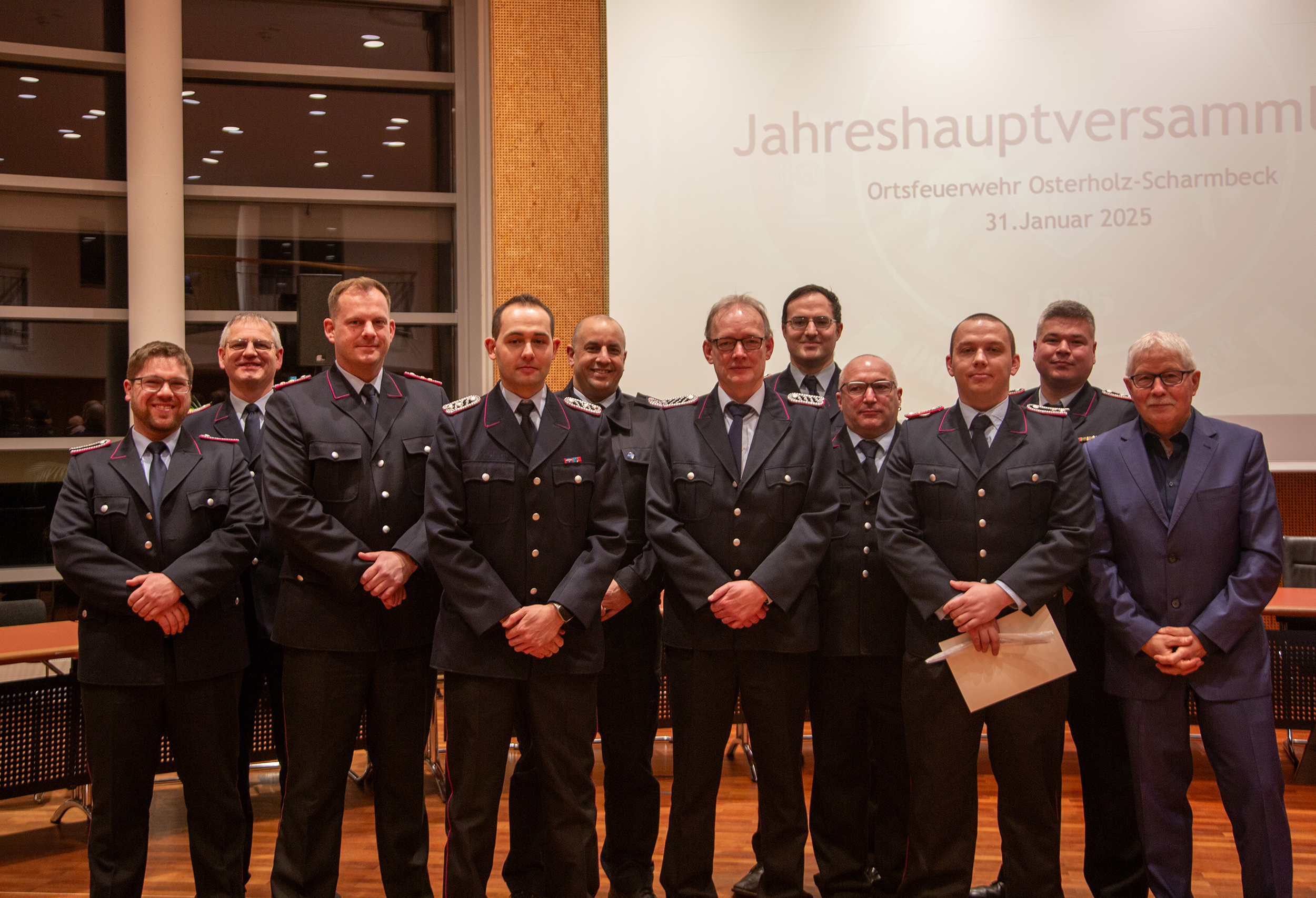 Befördert wurden: Daniel Hartmann, Jason Raschke, Arved Walpuski und Josephine Wulf (Feuerwehrmann/Feuerwehrfrau), Timm Freund, Kay Katenkamp, Majanka Recht, Jannik Soltner und Erich Steer (Oberfeuerwehrmann/Oberfeuerwehrfrau), Thimon Chuttek, Mailo Gruner und Hendrik Schumacher (Hauptfeuerwehrmann), Sascha Gerkens und Niklas Schilling (Löschmeister), Carsten Bredemeier (Oberlöschmeister), Cüneyt Yumusak (Brandmeister).