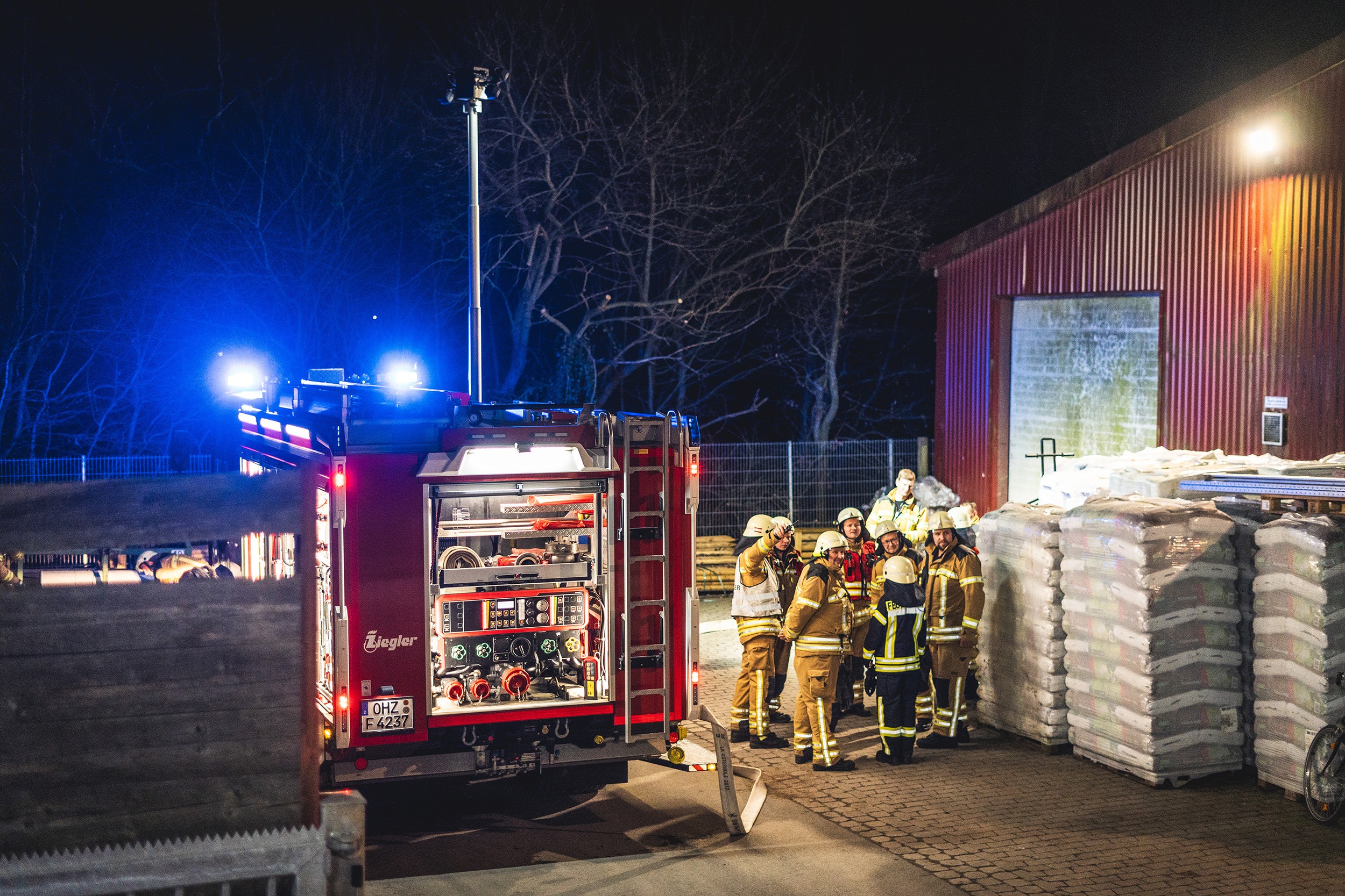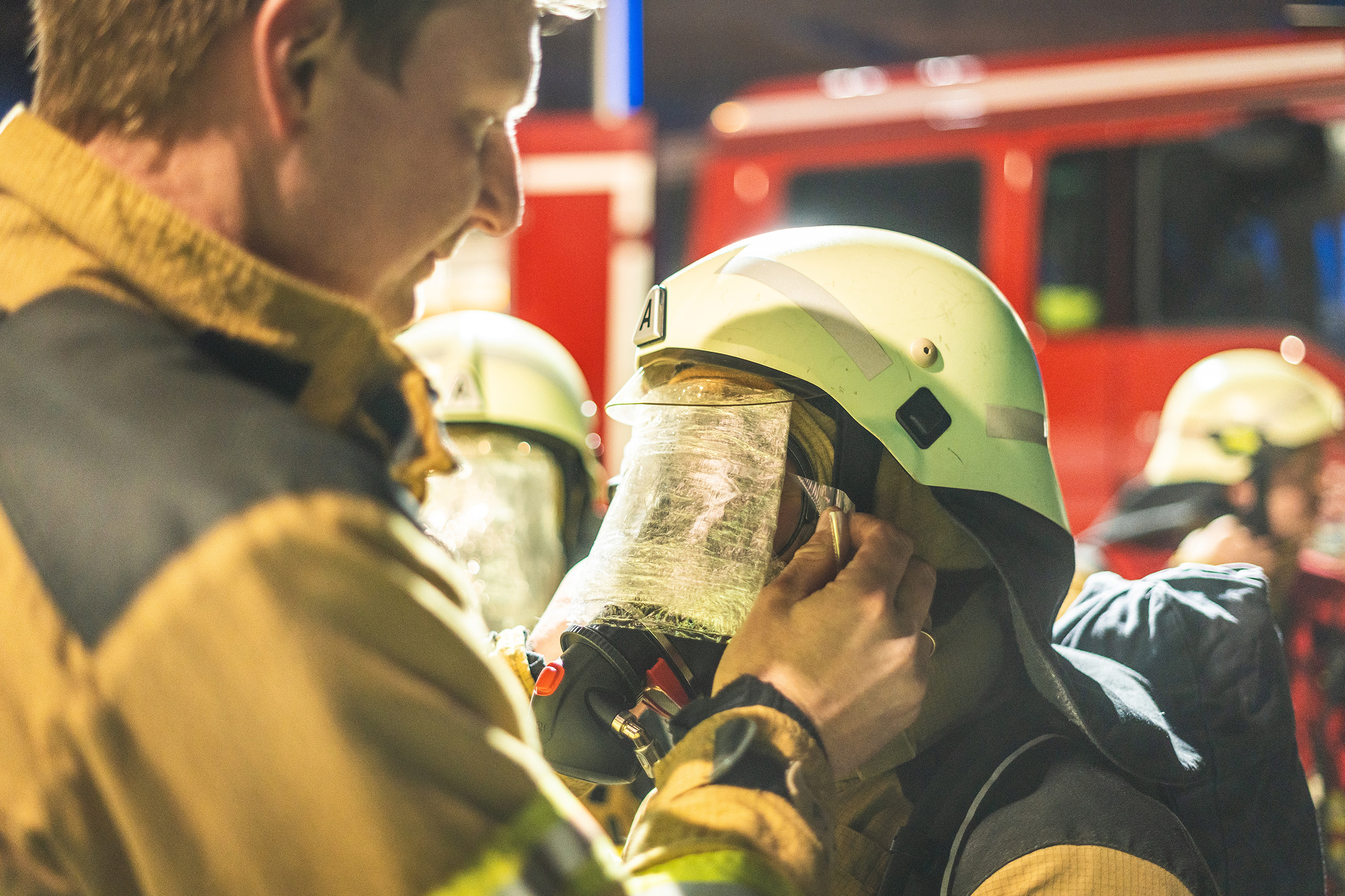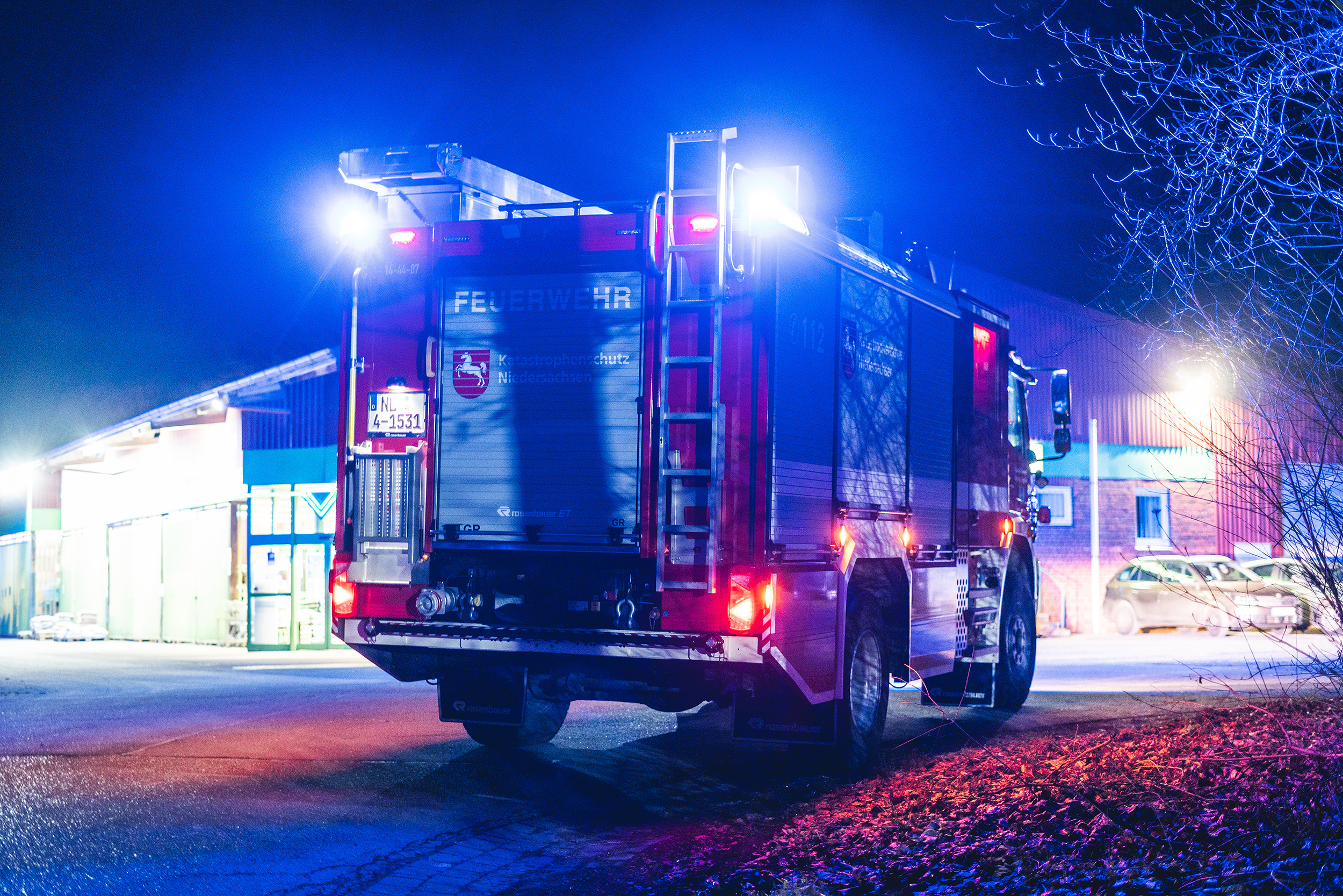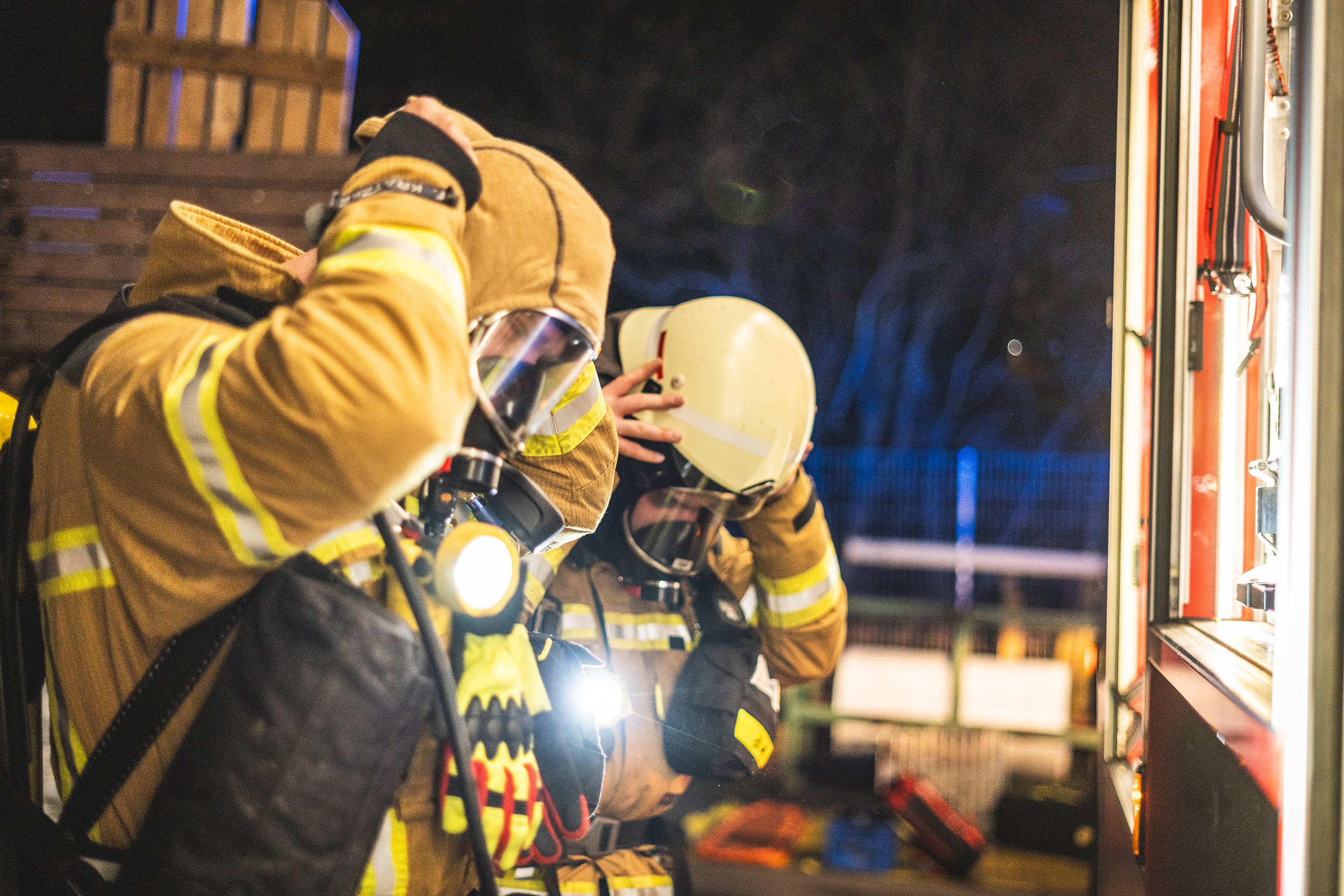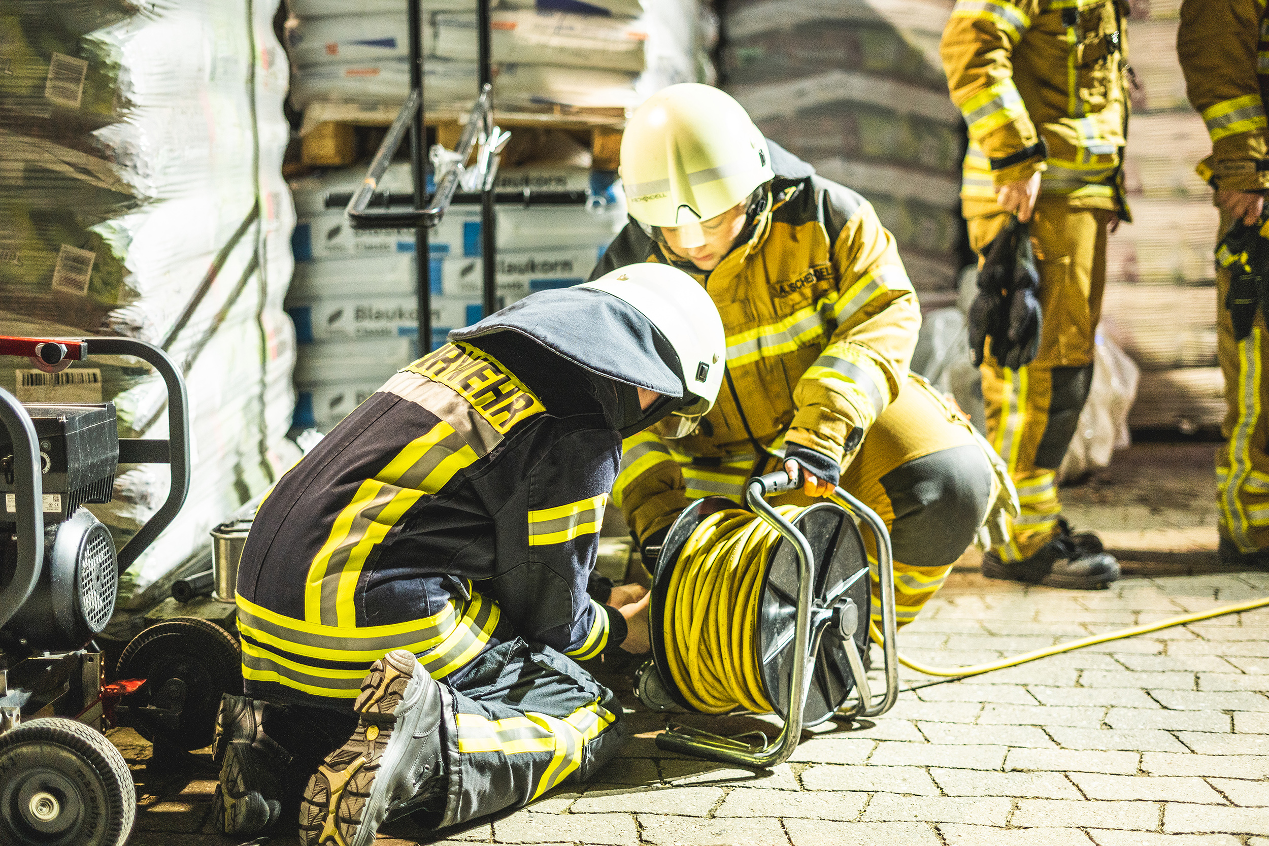 Durch eine Verkettung unglücklicher Umstände war es infolge der Kollision zwischen Lkw und Gebäude zu einem Brandausbruch im inneren des Gebäudes gekommen. Die Ortsfeuerwehr Pennigbüttel übernahm die Aufgabe der Brandbekämpfung. Mehrere Trupps unter Atemschutz gingen in das Gebäude vor. Um hier eine realistische Null-Sicht zu simulieren, wurden die Masken der Atemschutzgeräteträger mit Folie verklebt.