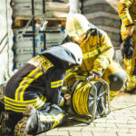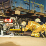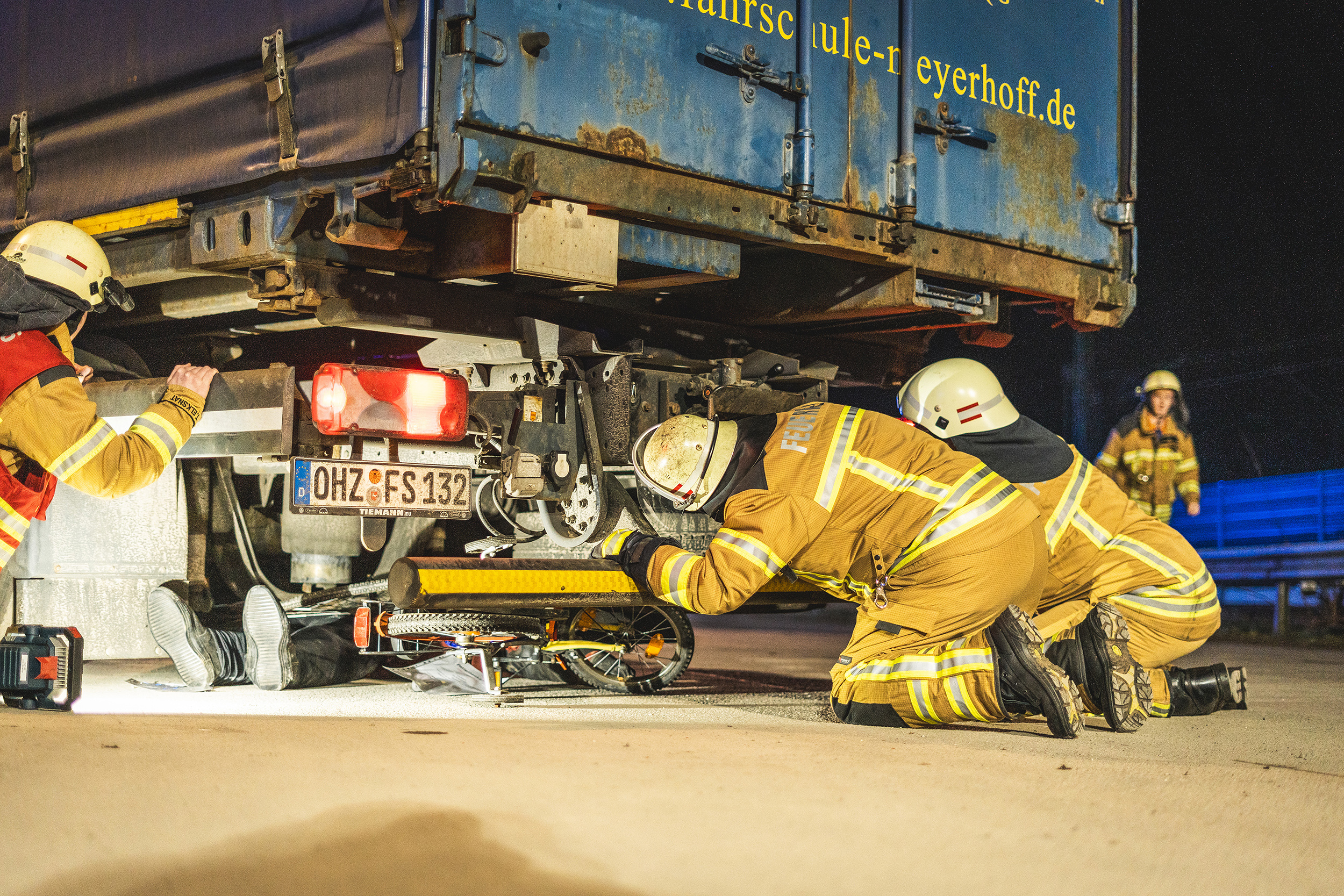 Vor Ort stellte sich die „Lage“ dann aber weitaus komplexer dar: Ein Lkw mit Auflieger war beim Versuch, einem Fahrradfahrer auszuweichen, mit der Mauer eines Gebäudes kollidiert. Der Fahrer des Lkw klagte über massive Schmerzen im Rückenbereich und musste schonend aus dem Fahrzeug gerettet werden. Bei der Erkundung stellten die Einsatzkräfte fest, dass der Fahrradfahrer vom Auflieger des Lkw erfasst und unter den Rädern der Hinterachse eingeklemmt war. Umgehend begann eine anspruchsvolle technische Rettung.