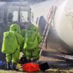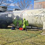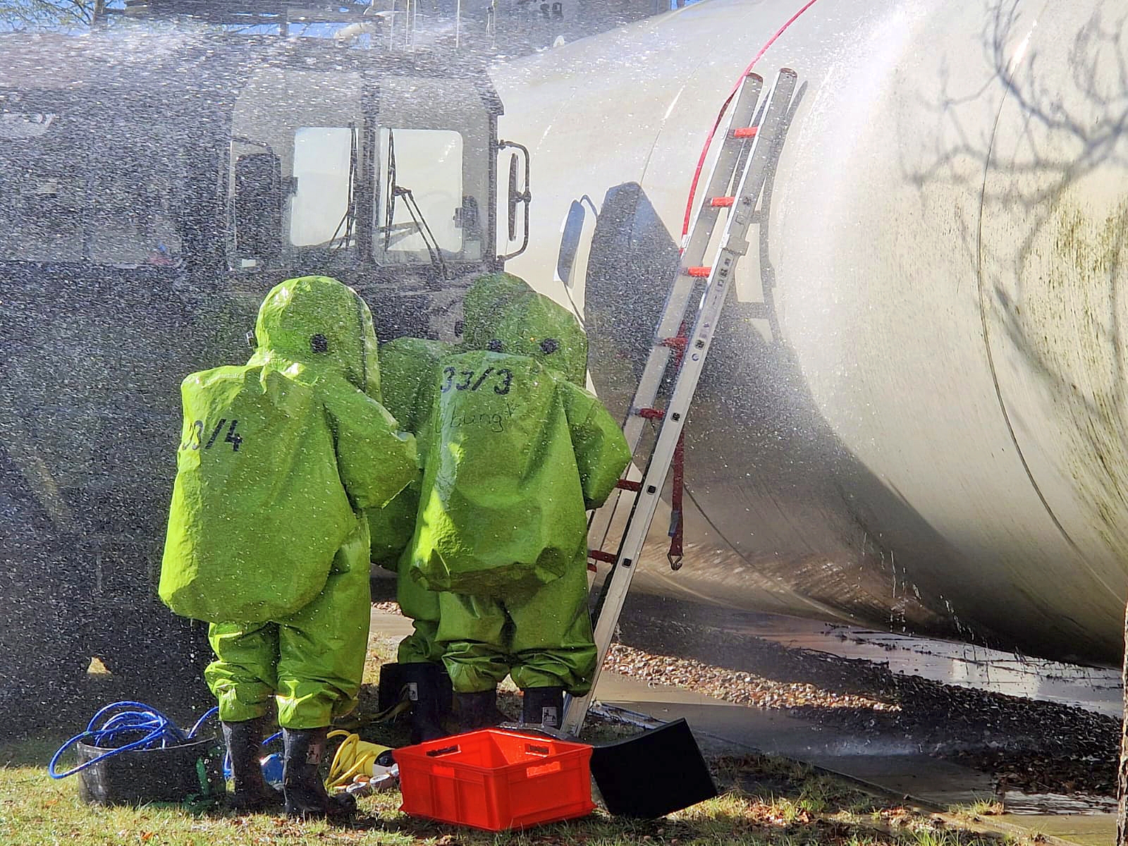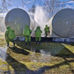 Weitere Trupps unter schweren Atemschutz sicherten dabei den Tank und den LKW mithilfe von Wasser und schlugen die Dämpfe weiter nieder, bis die Kräfte des Umweltschutzzuges in Chemieschutzanzügen den Riss am Tank verschließen konnten.
