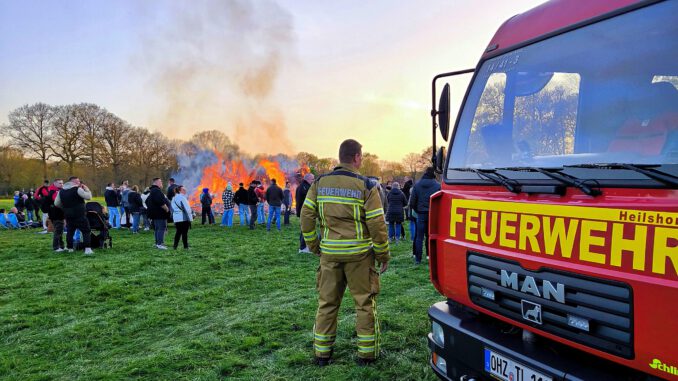 Die Einsatzkräfte der Feuerwehr Heilshorn sicherten das Osterfeuer vor Ort ab. Um Gefahren vorzubeugen wurden hierzu knapp 11 Kubik Löschwasser am Platz bereitgestellt und der Zugang für Fahrzeuge auf die Weide gesperrt.
