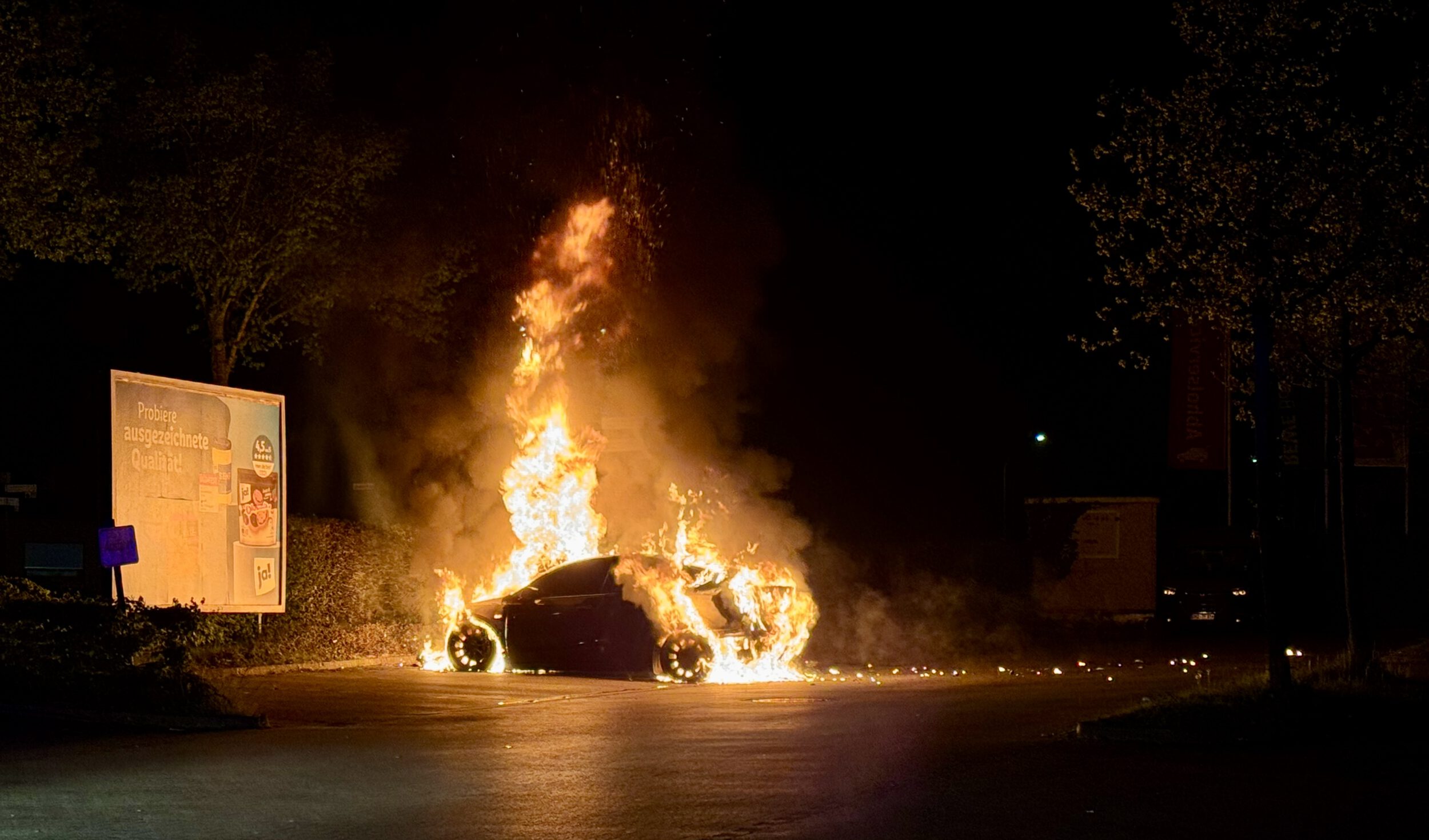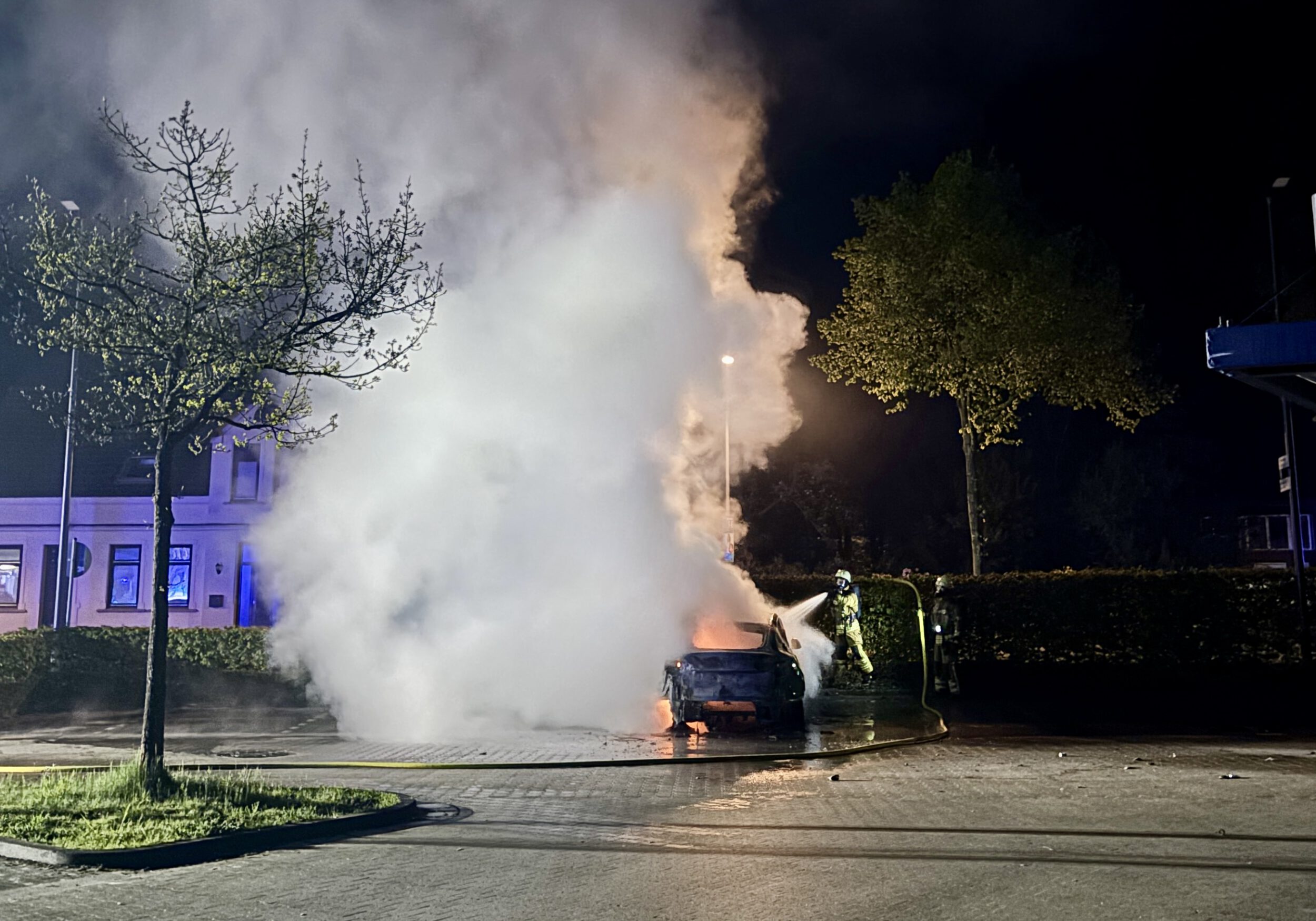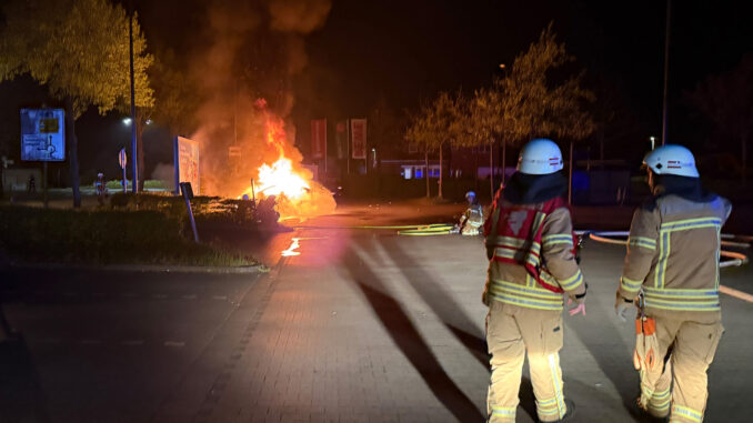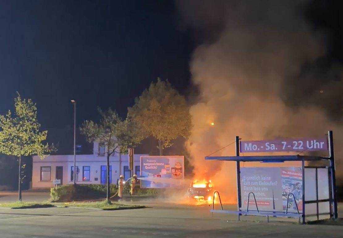 Die Ortsfeuerwehr Osterholz-Scharmbeck wurde in der Nacht zum Samstag mit dem Stichwort „Pkw-Brand“ zum Parkplatz eines Supermarktes an der Ritterhuder Straße alarmiert. Für die bereits fünf Minuten nach der Alarmierung eintreffenden ersten Kräfte bestätigte sich die Lage. Ein Tesla brannte in voller Ausdehnung.