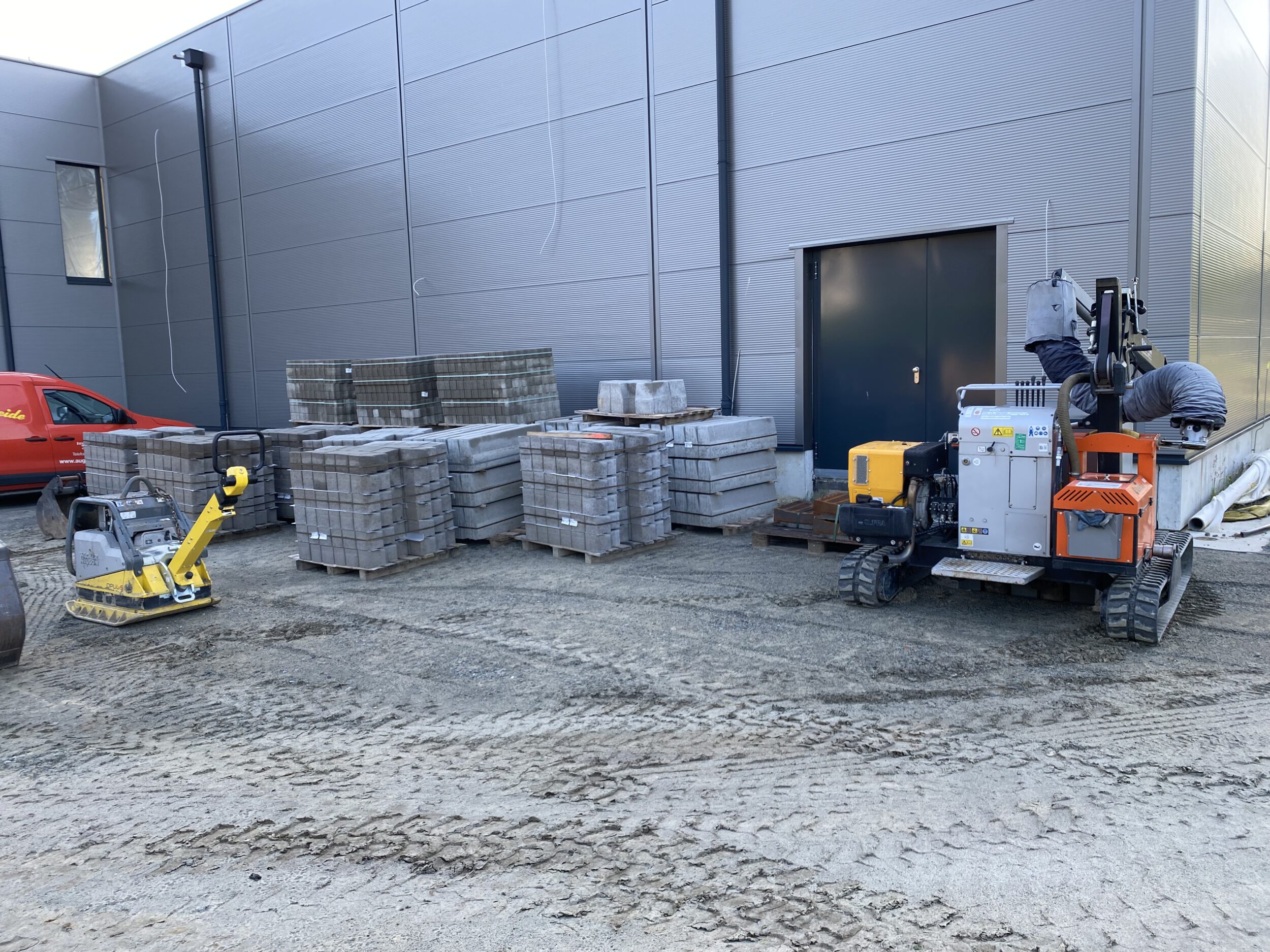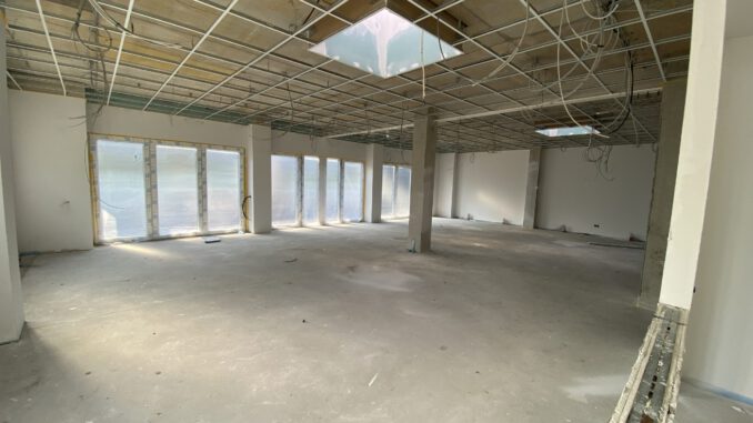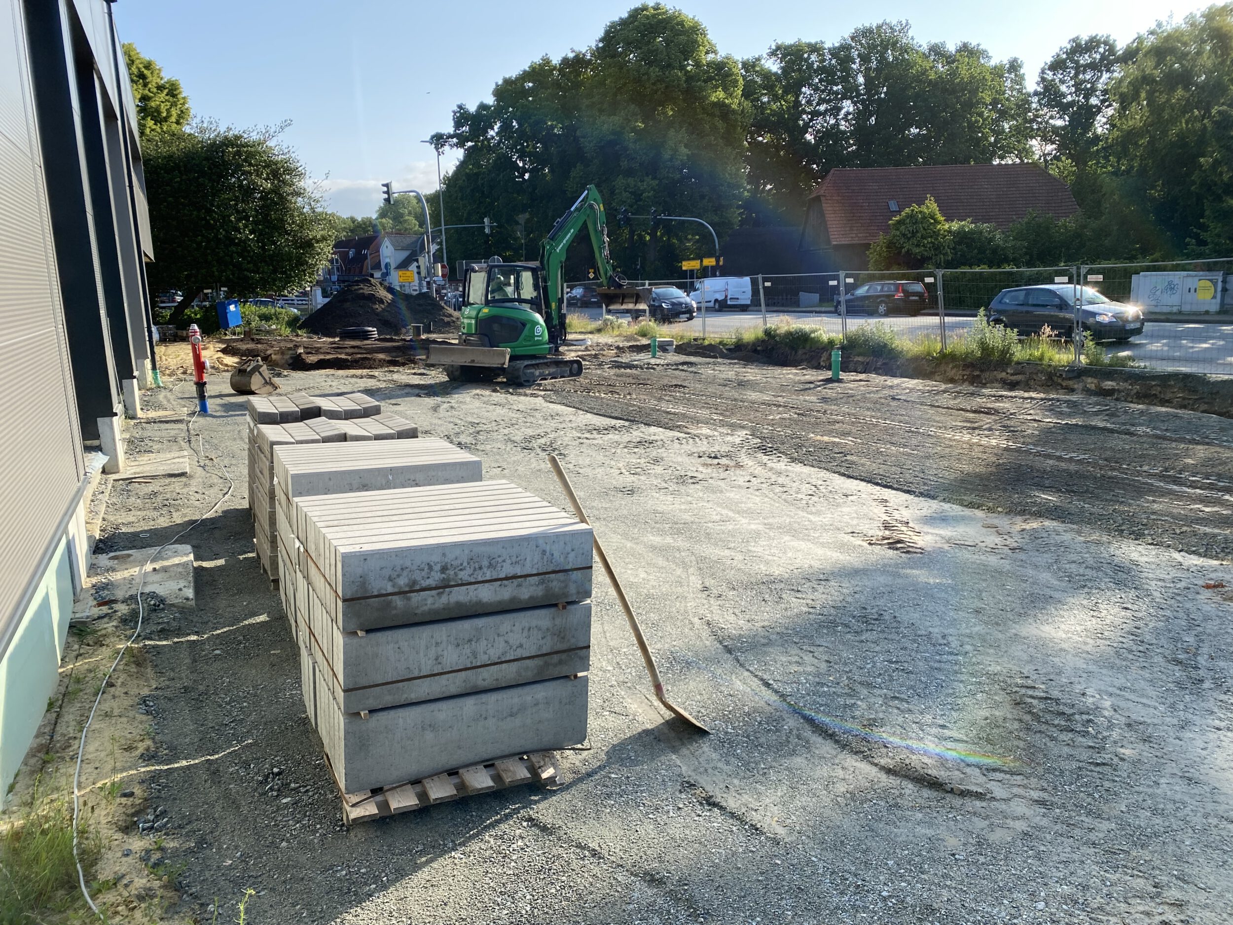 Die Malerarbeiten im Innenbereich sind derzeit in vollem Gange. Nach aktuellem Stand soll diese Phase bis Mitte Juli abgeschlossen sein. Parallel dazu ist die Firma Grewe mit der Gestaltung der Außenanlagen beschäftigt. Derzeit wird die Fläche vor den Hallentoren vorbereitet, um anschließend mit dem Pflastern beginnen zu können.