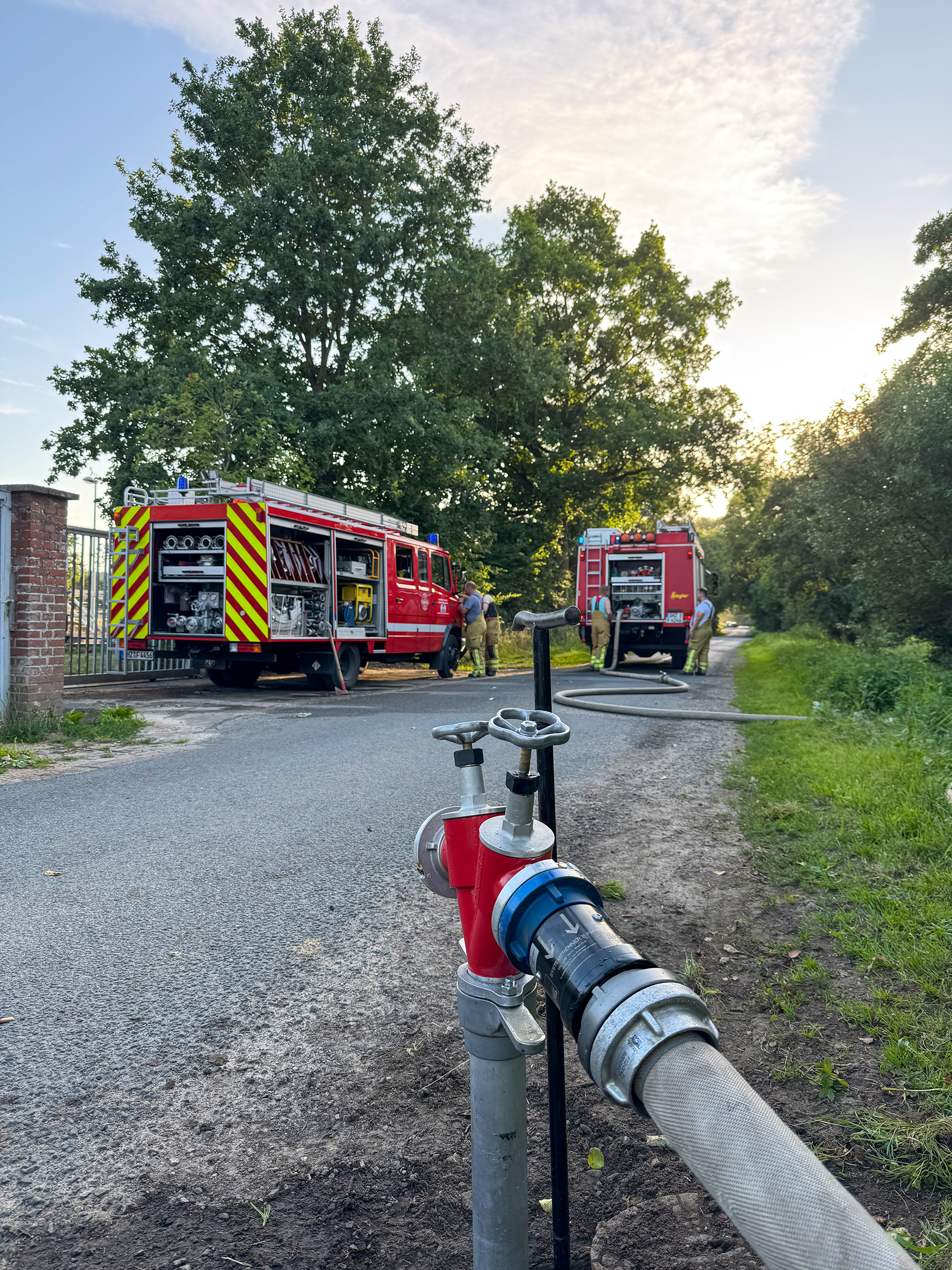Aufgrund der zu erwartenden schwierigen Löschwasserversorgung ließ der Einsatzleiter umgehend die Tanklöschfahrzeuge der Ortsfeuerwehren Pennigbüttel und Scharmbeckstotel nachalarmieren. Gemeinsam mit dem Tanklöschfahrzeug aus Osterholz-Scharmbeck brachten diese beiden Fahrzeuge im Pendelverkehr mit ihren 3.000 und 4.000 Liter großen Tanks von extra eingerichteten Wasserentnahmenstellen das Löschwasser zur Einsatzstelle.