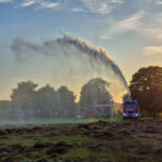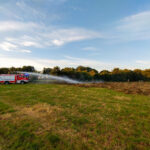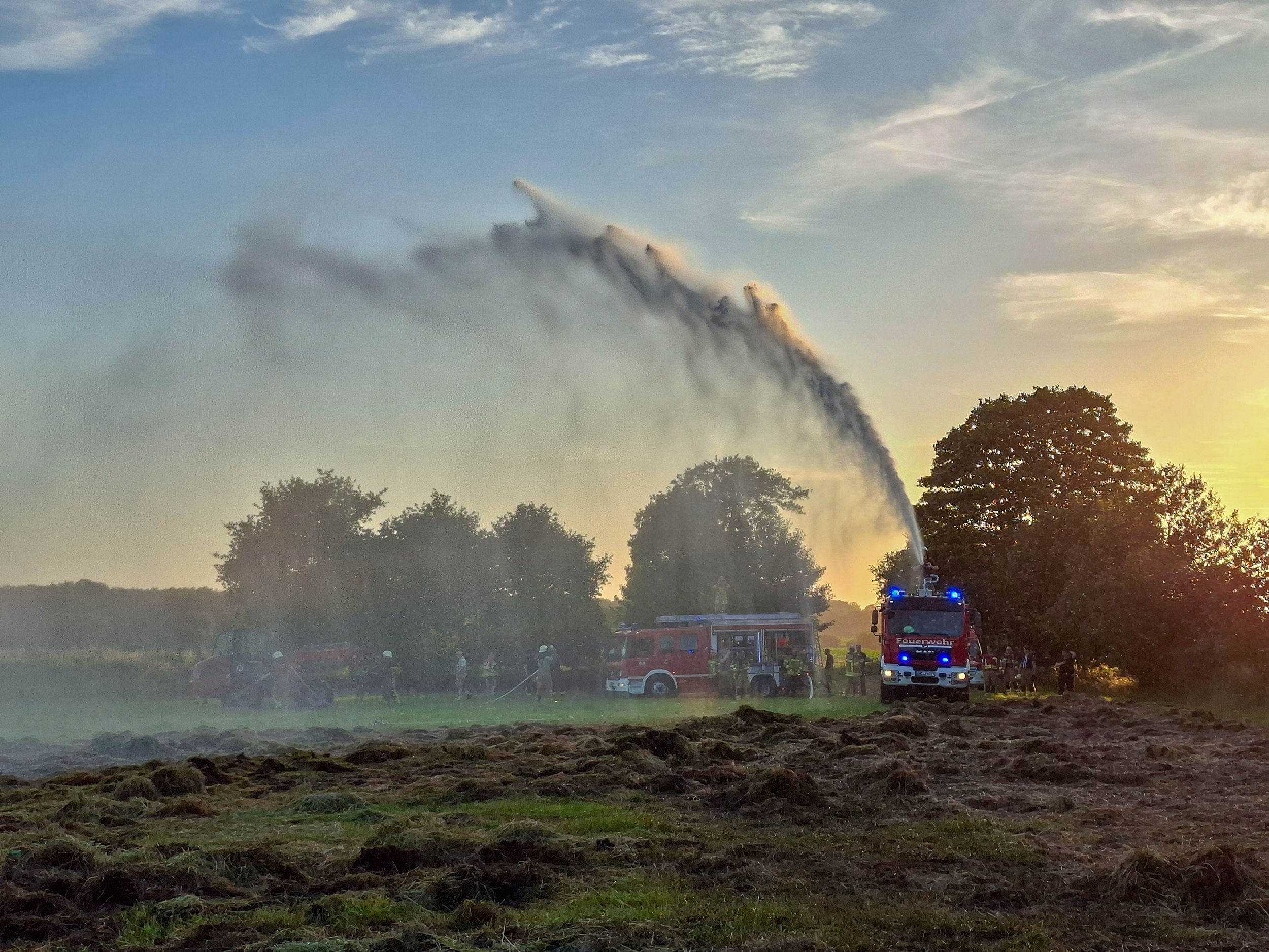 Mit schwerem Gerät wurden die Ballen auseinandergezogen und mussten aufwendig einzeln abgelöscht werden. Nach rund zwei Stunden waren die Löscharbeiten abgeschlossen. Sicherheitshalber wurde die Brandstelle nochmals großflächig mit dem Wasserwerfer vom Dach des Pennigbütteler Tanklöschfahrzeugs gewässert, bevor die Einsatzkräfte gegen 22 Uhr wieder zurück an ihre Standorte kehrten.