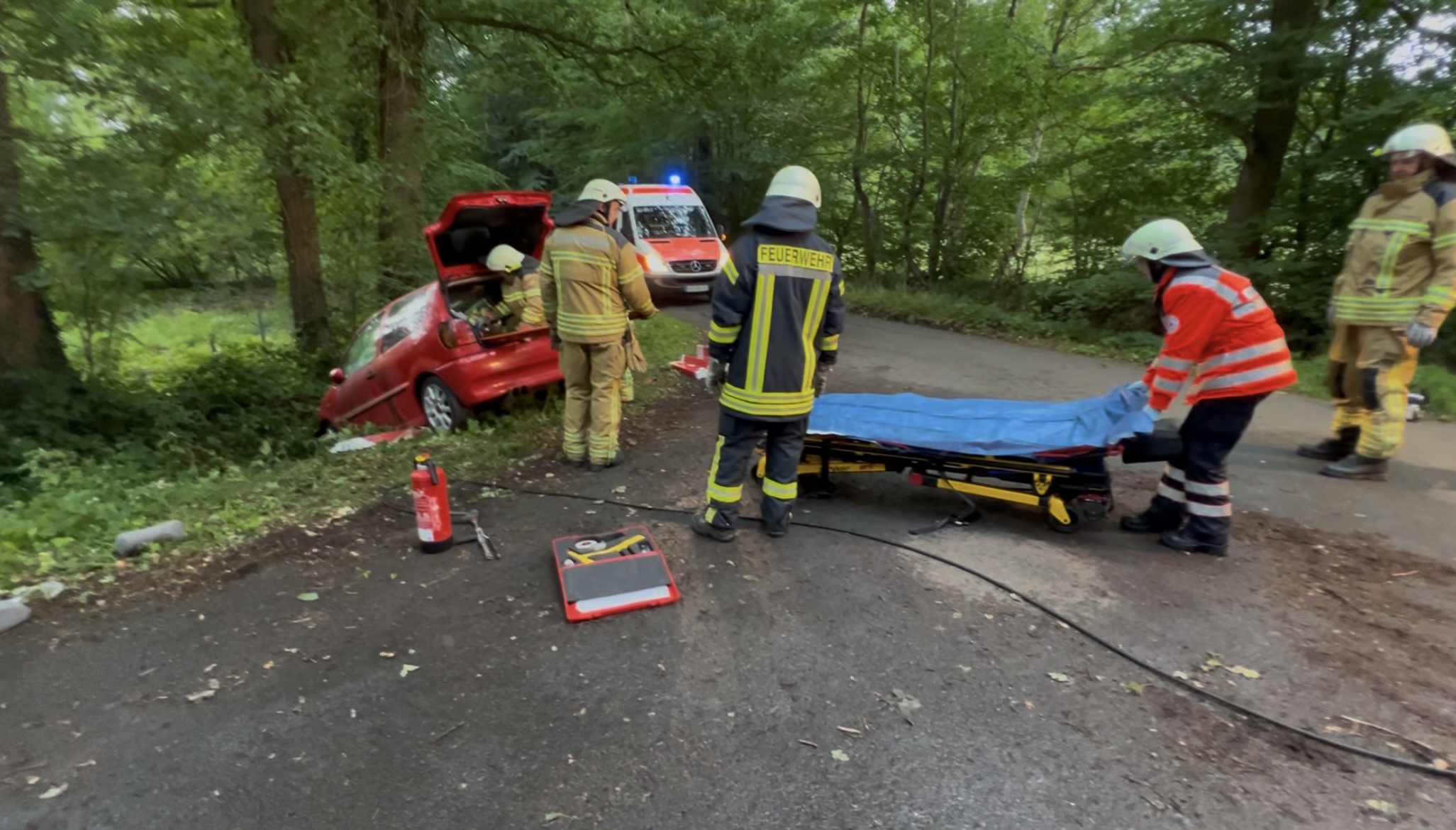 Für die eintreffende Feuerwehr Hülseberg galt es zunächst, die Unfallstelle abzusichern, den Brandschutz sicherzustellen und das verunfallte Fahrzeug gegen Erschütterungen oder ein mögliches Wegrollen zu sichern.