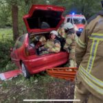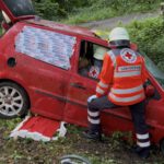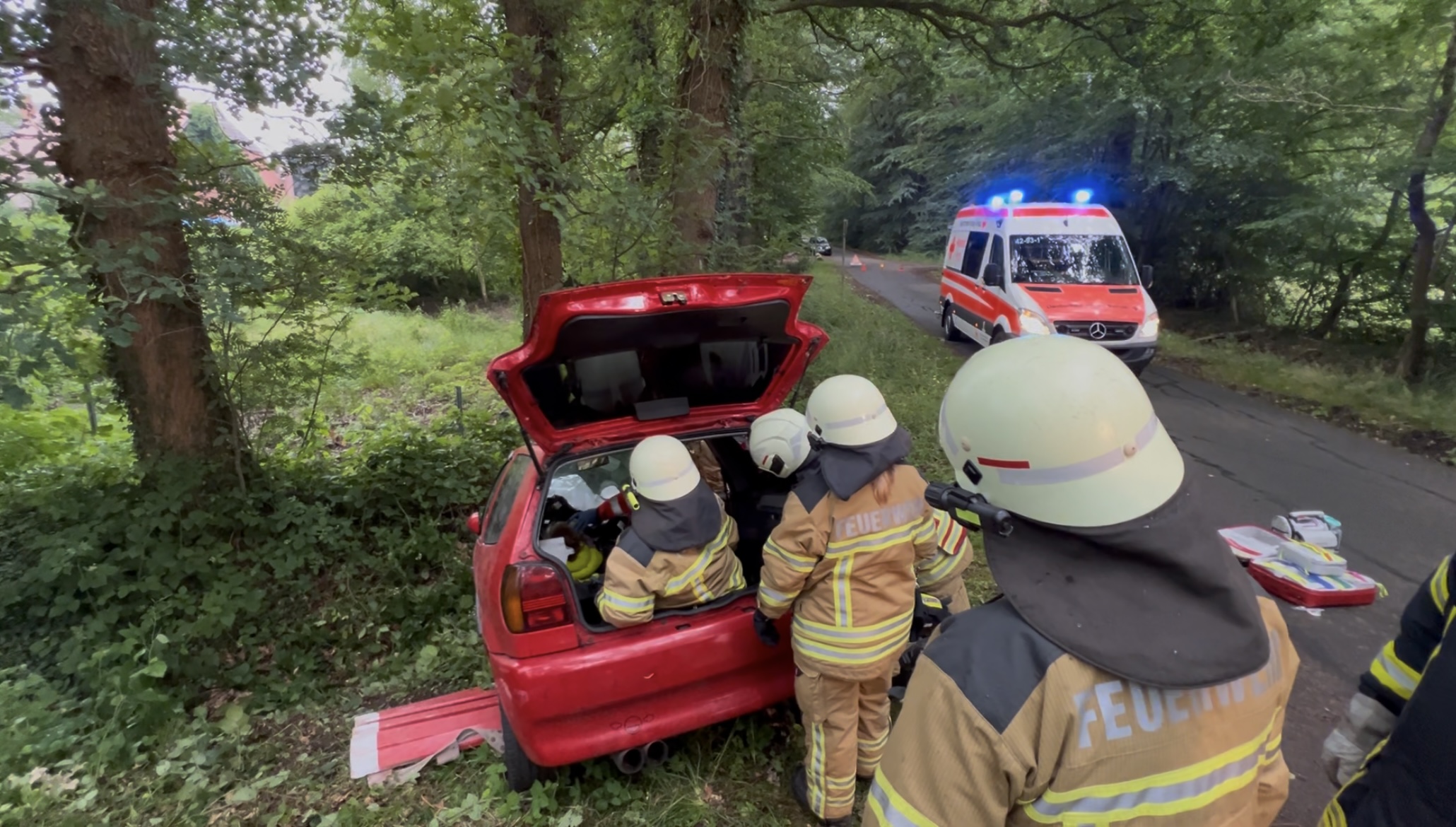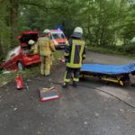 Die Führungskräfte der Feuerwehr und des DRK hatten hierzu eine realitätsnahe Übungslage vorbereitet. Das Szenario: Eine Fahrerin war mit ihrem Kleinwagen auf einer Nebenstraße unterwegs, verlor aufgrund überhöhter Geschwindigkeit auf nasser Fahrbahn die Kontrolle über ihr Fahrzeug, prallte gegen einen Baum und kam im Straßengraben zum Stehen.