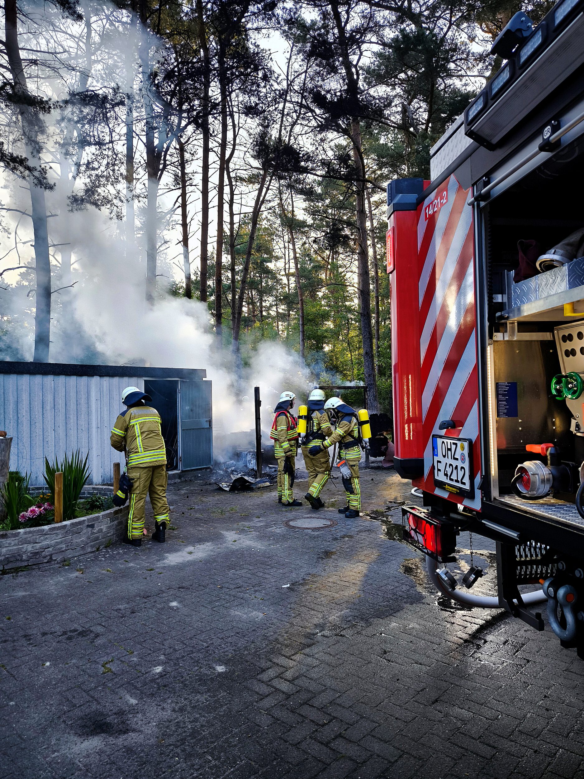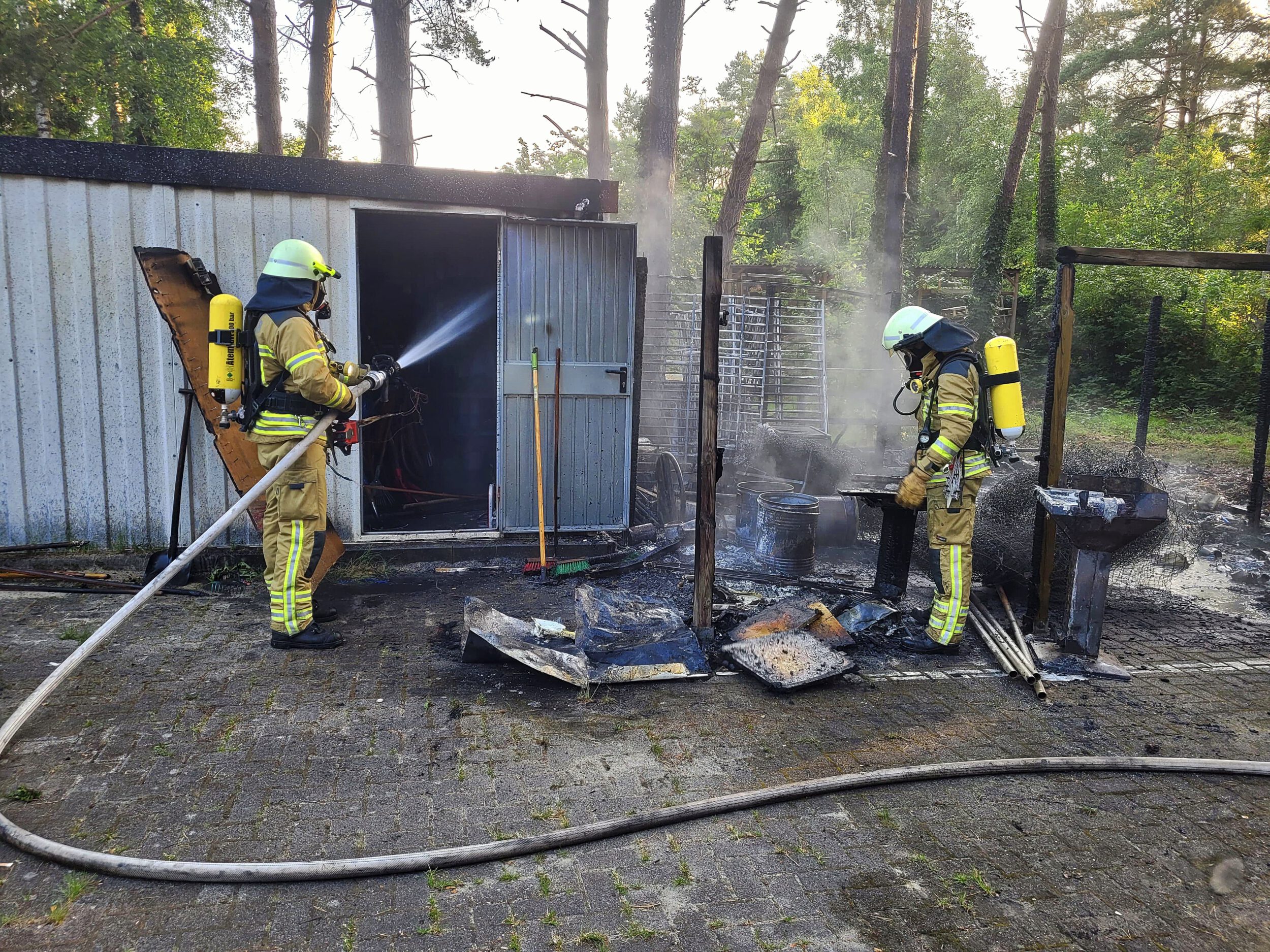 In Zusammenarbeit stellten die Kräfte der Ortsfeuerwehren eine Wasserversorgung her und ein zweiter Trupp unter Atemschutz unterstützte bei der Brandbekämpfung.