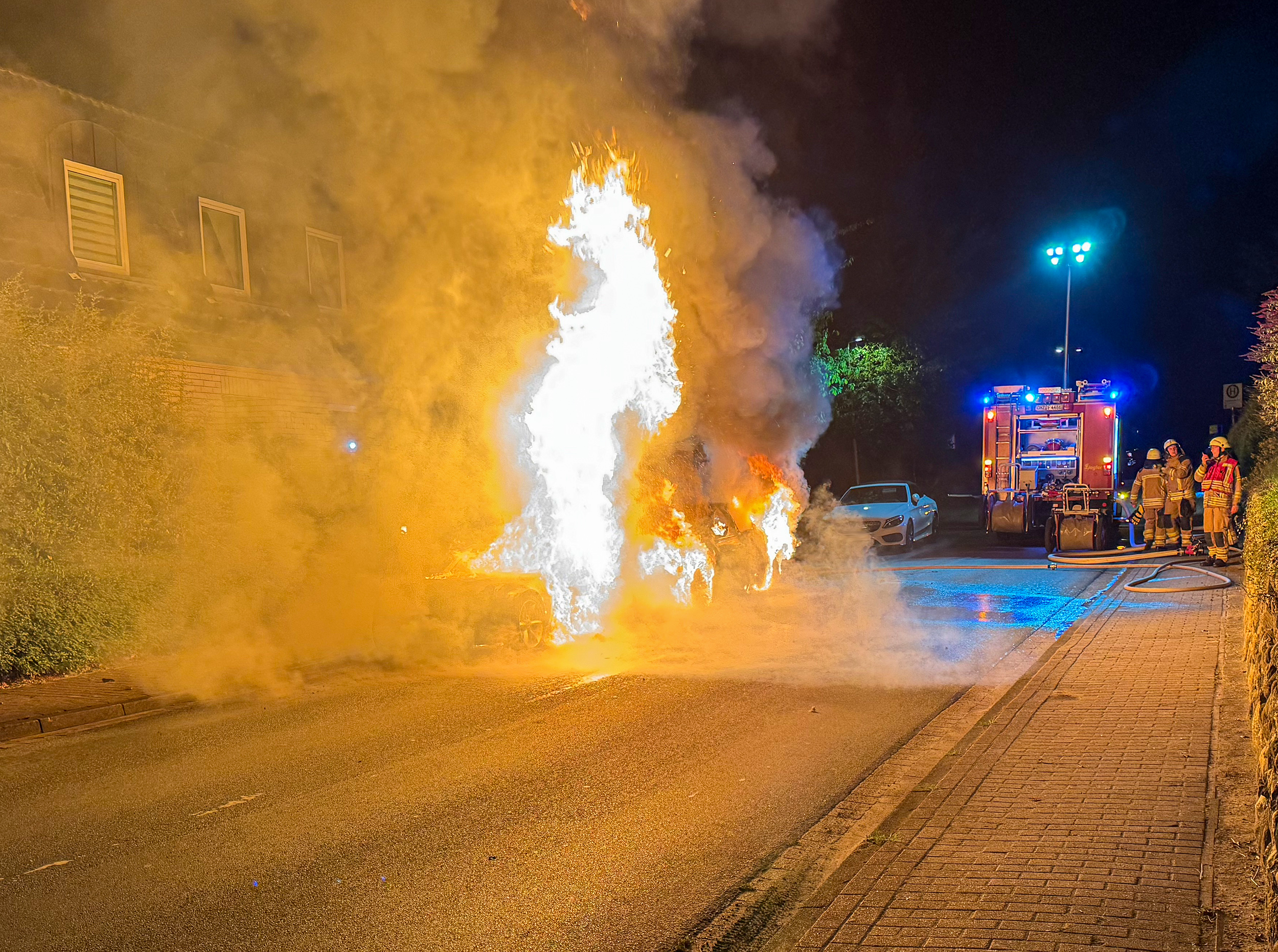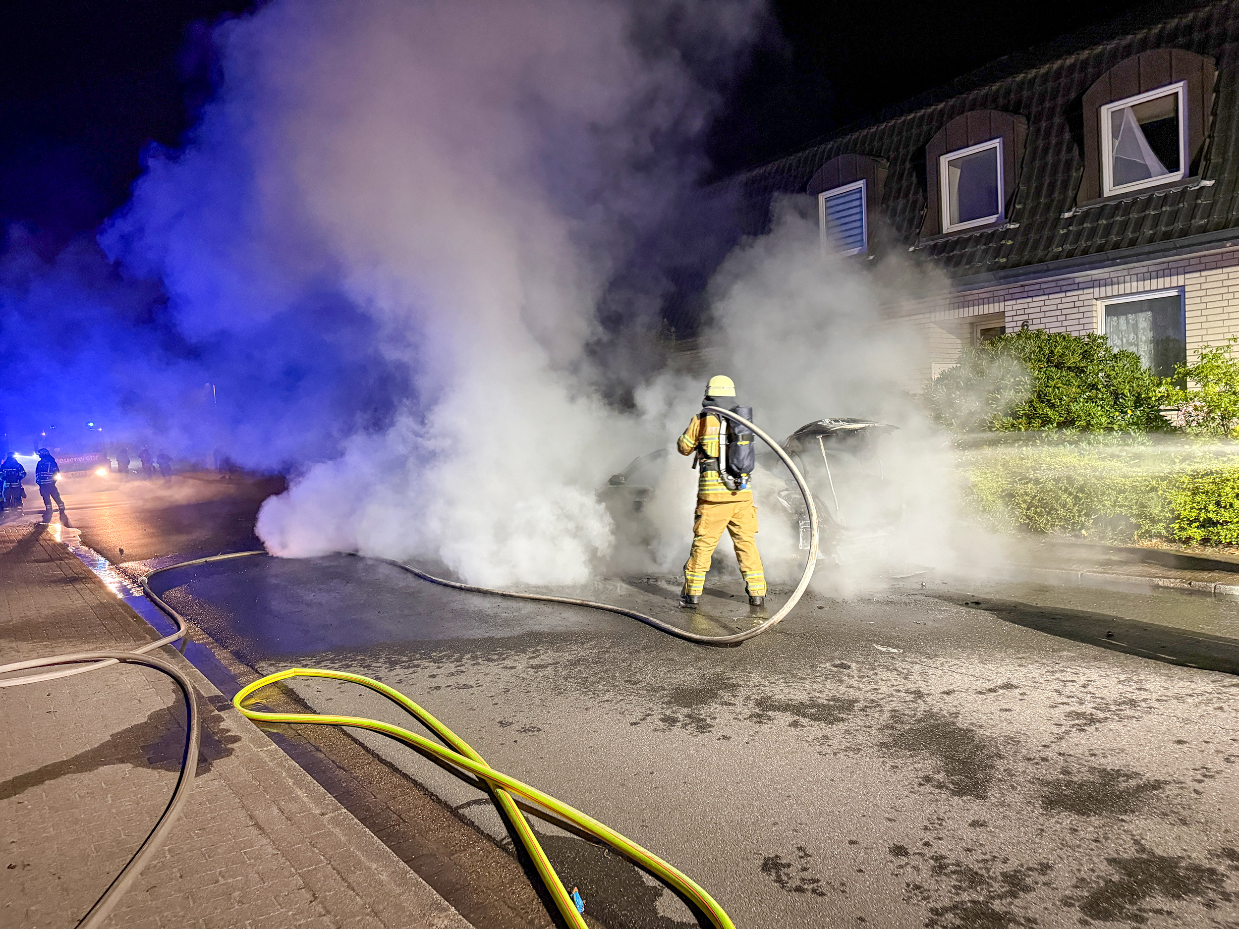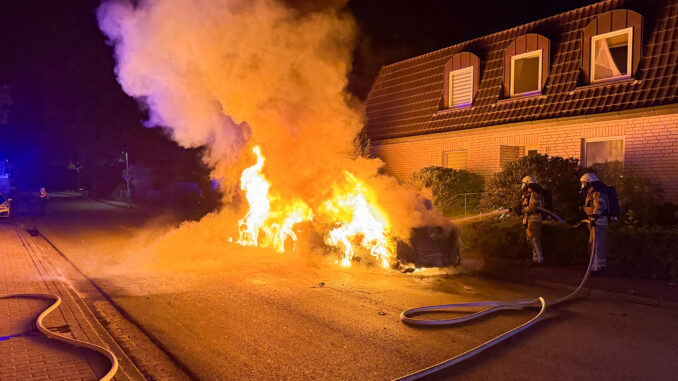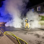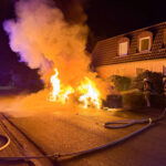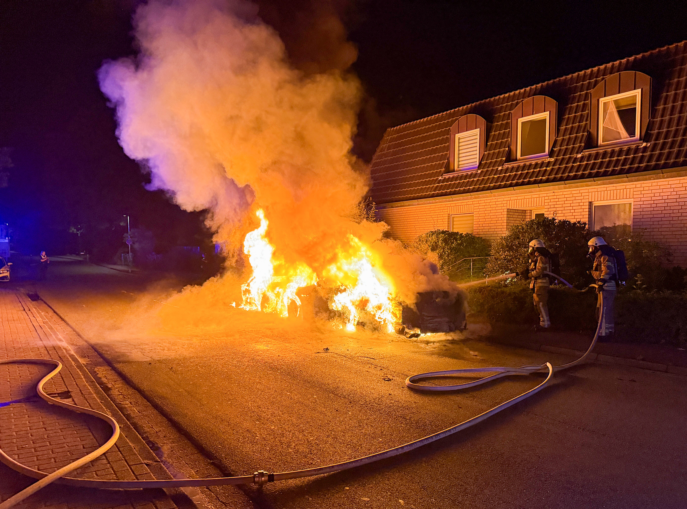 Die Ortsfeuerwehr Osterholz-Scharmbeck wurde in der Nacht zum Donnerstag mit dem Stichwort „Pkw-Brand“ in die Käthe-Kollwitz-Straße alarmiert. Dort befanden sich zwei Pkw in Vollbrand. Die Bewohner des nur wenige Meter entfernten Wohnhauses hatten geistesgegenwärtig alle Fenster geschlossen und das Gebäude sicherheitshalber verlassen. Ein Trupp unter Atemschutz ging mit einem C-Rohr zur Brandbekämpfung vor, parallel wurde eine Wasserversorgung aus dem Hydrantennetz aufgebaut.