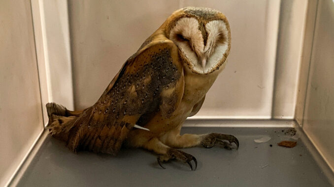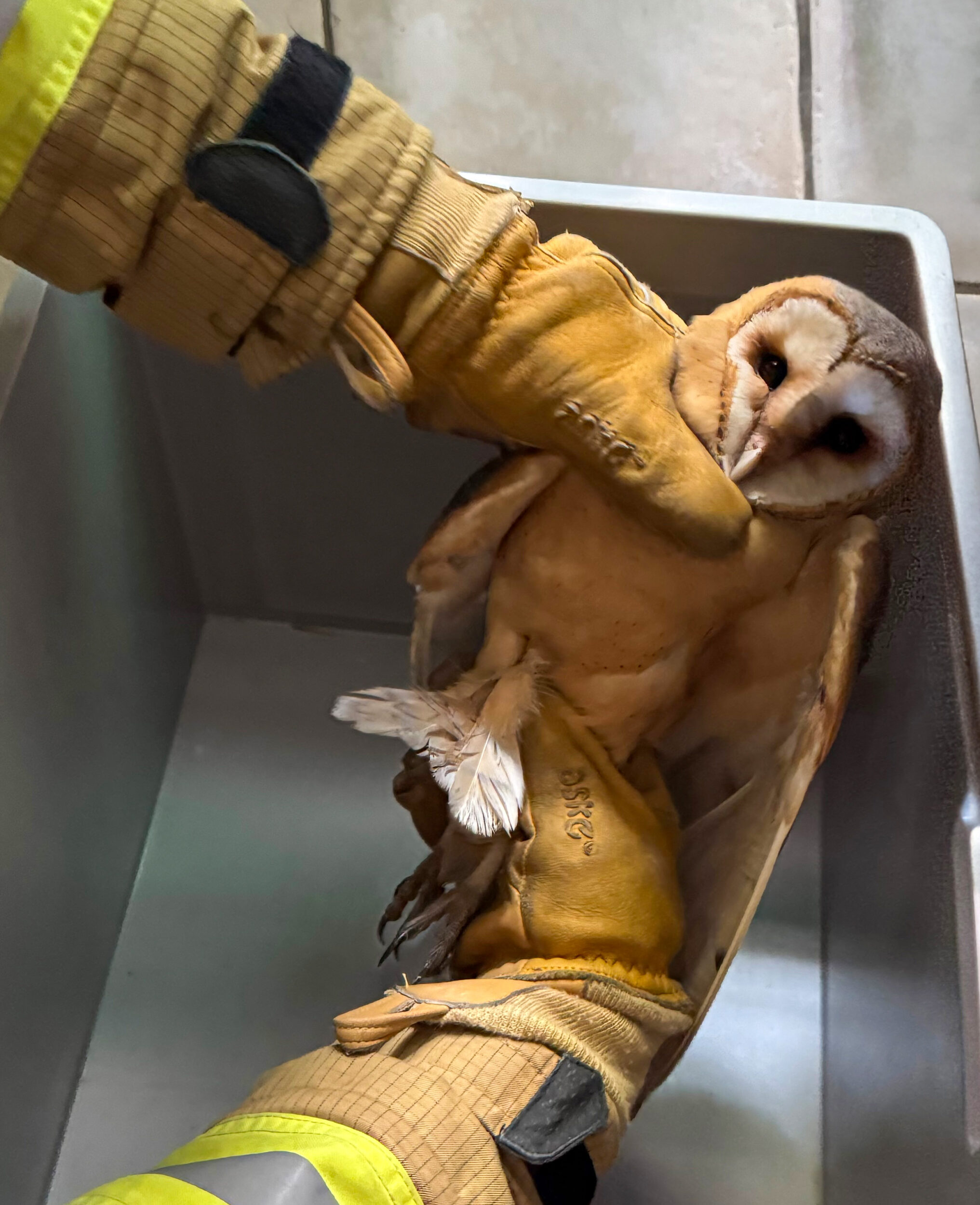 Die Einsatzkräfte stellten fest, dass sich das Tier glücklicherweise in der Nähe einer Revisionsklappe des Schornsteins befand. So konnte ein im Umgang mit Wildvögeln erfahrener Feuerwehrmann, der glücklicherweise mit ausgerückt war, die Eule vorsichtig befreien und in einer Transportbox sichern. Da für Schleiereulen besondere Tierschutzbestimmungen gelten, stimmten sich die Einsatzkräfte für die anschließenden Schritte zunächst mit einem Falkner ab.