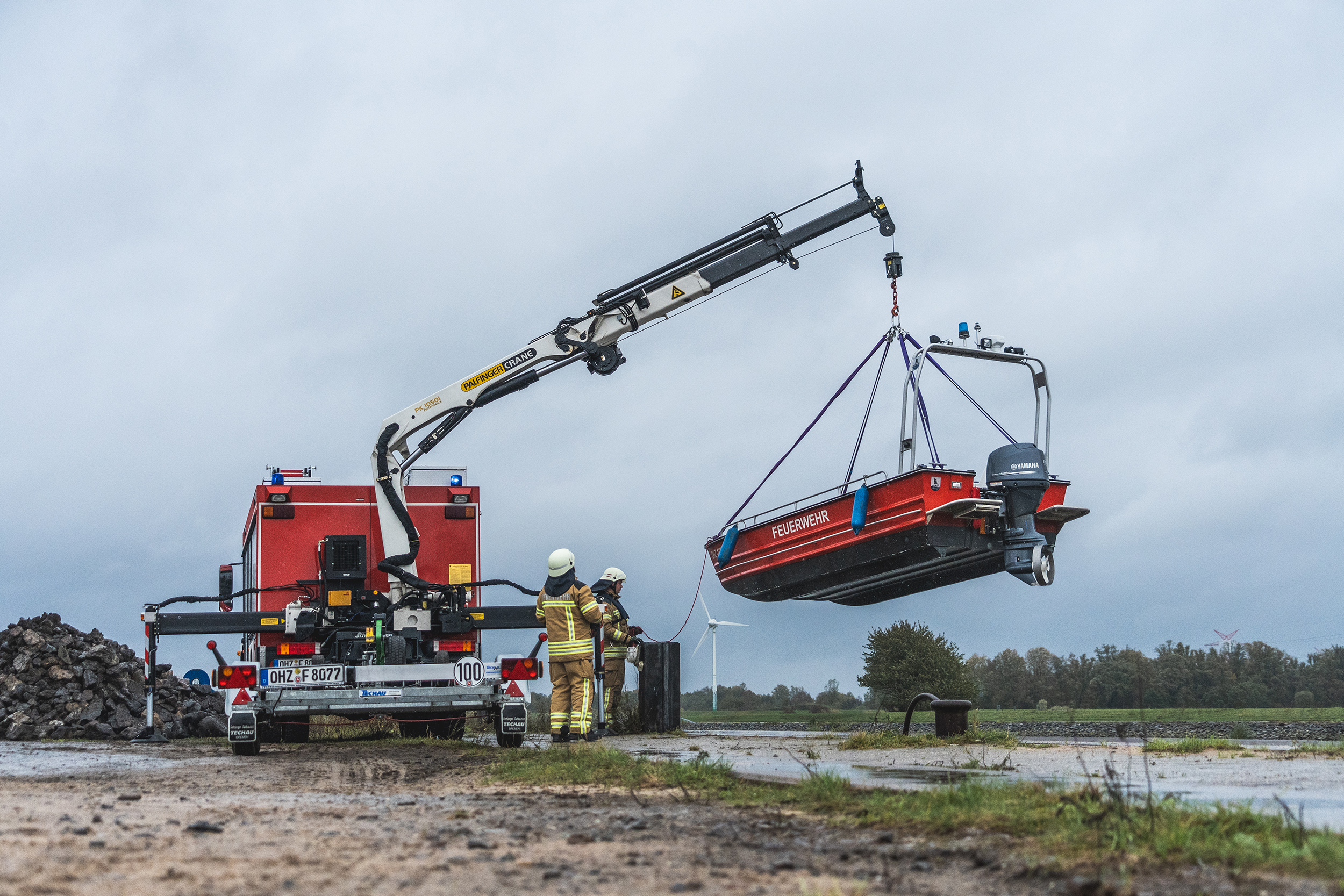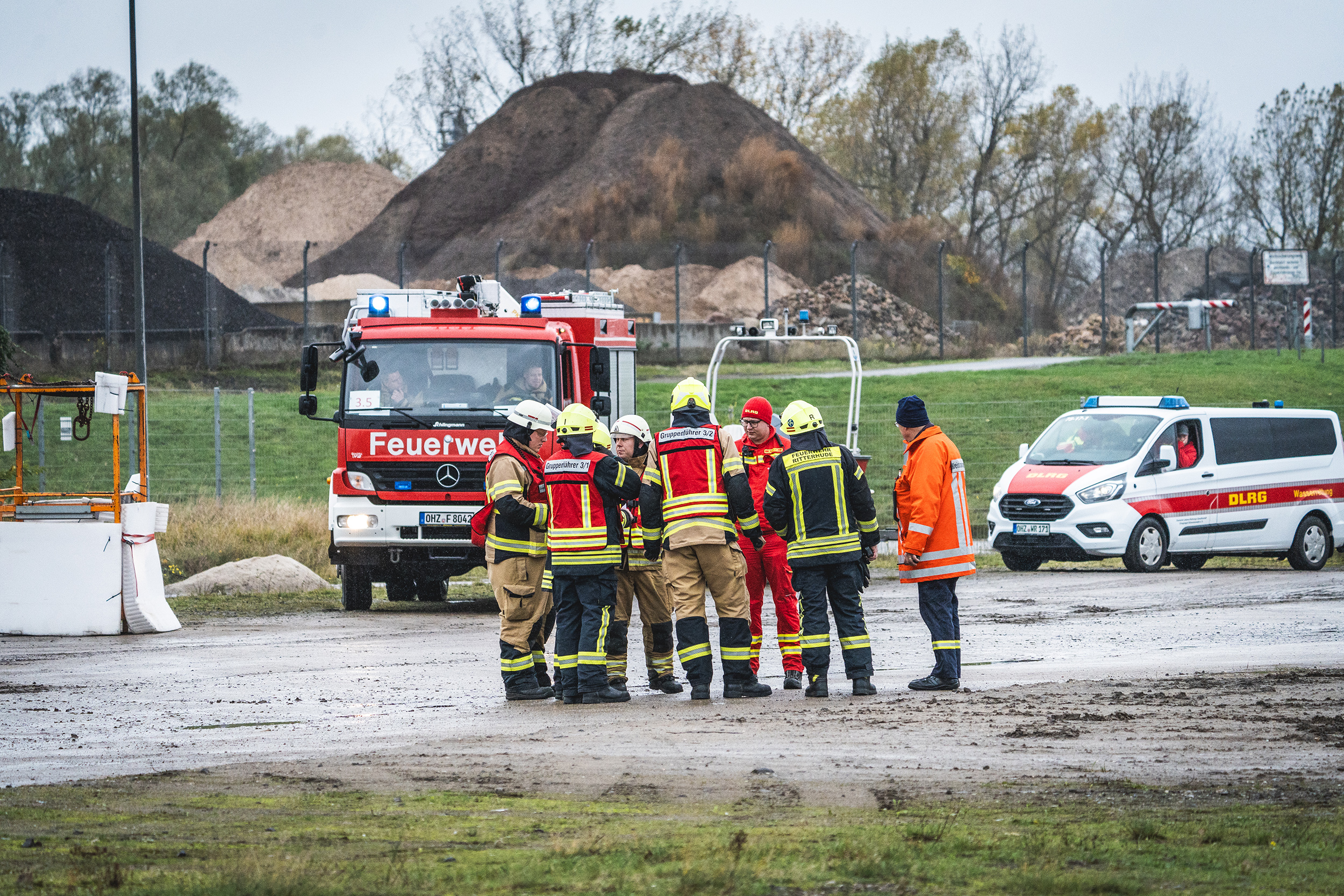 So sah sich der „Technische Zug“ am Ochtumer Hafen mit einem komplexen Verladeunfall konfrontiert. Ein Boot hing halbseitig an einem Mobilkran, der selbst zu kippen drohte. In dem Boot befanden sich Verletzte, eine unbekannte Anzahl an Personen war zudem ins Hafenbecken gestürzt. Während mittels eines Krans Boote von Feuerwehr und DLRG zu Wasser gelassen wurden, sicherten weitere Kräfte den havarierten Mobilkran und leiteten die Menschenrettung aus dem in der Luft hängenden Boot ein.