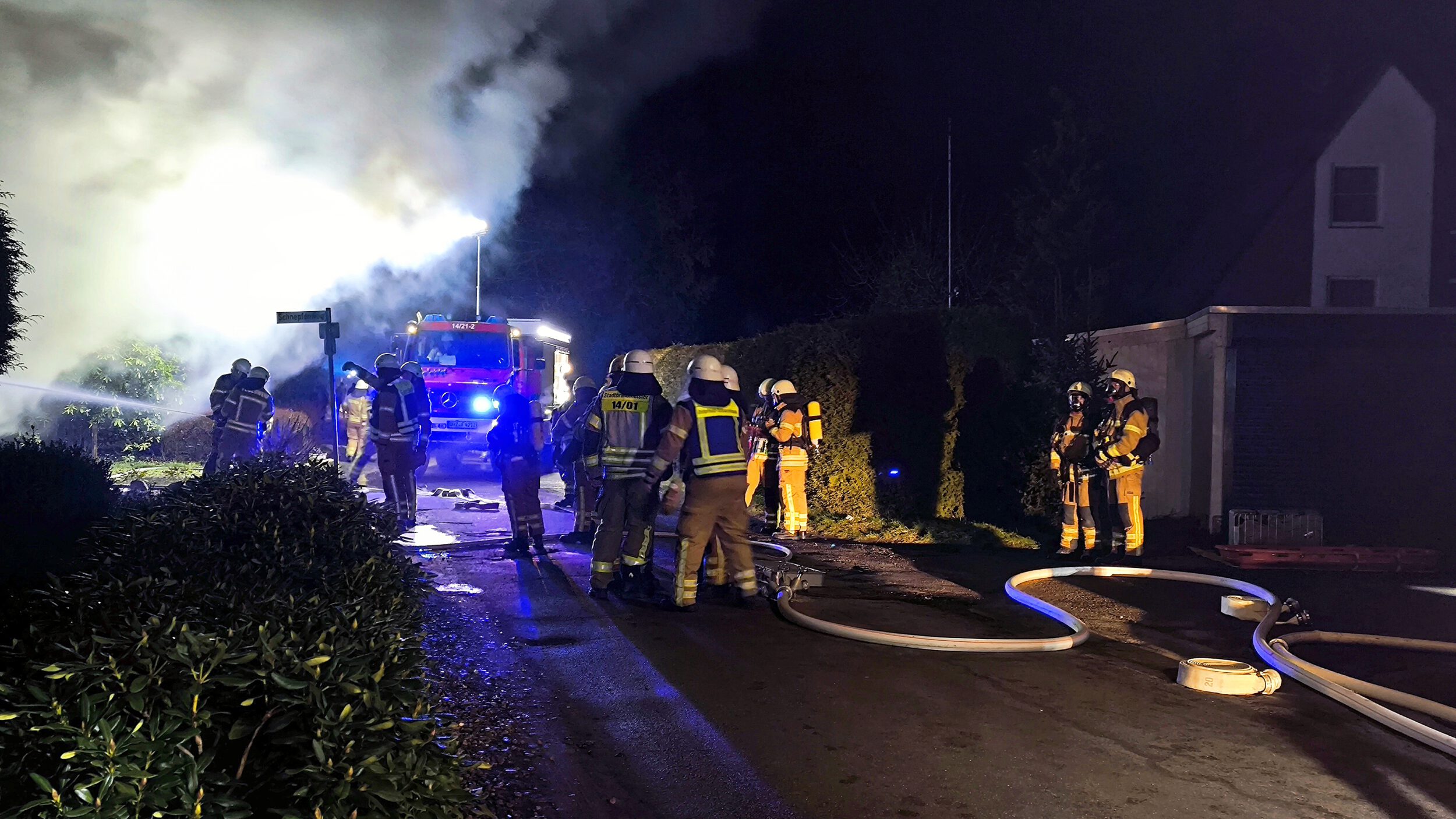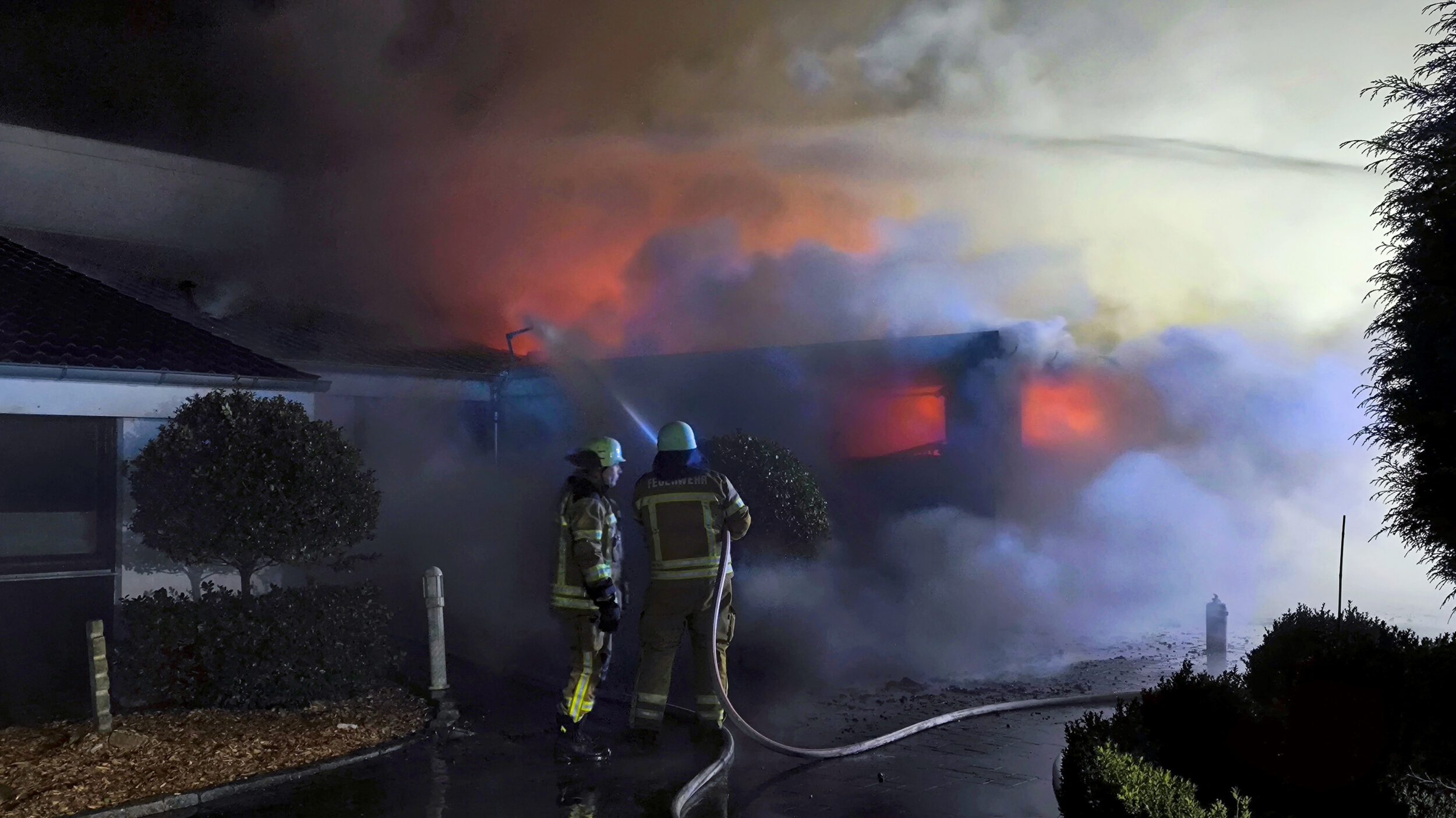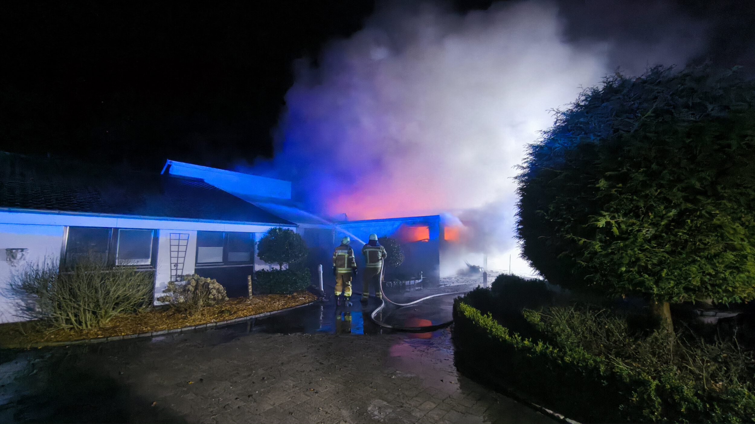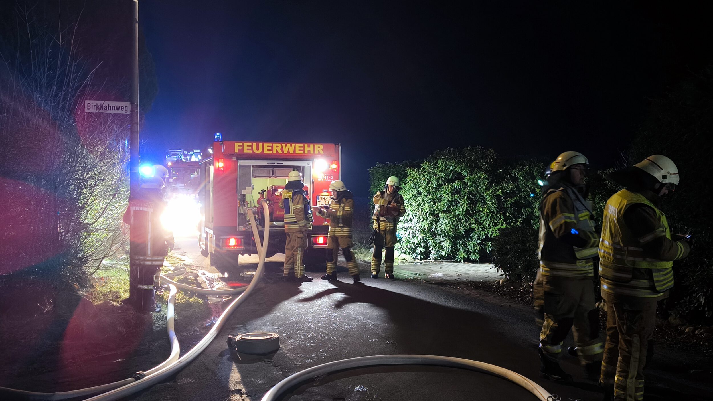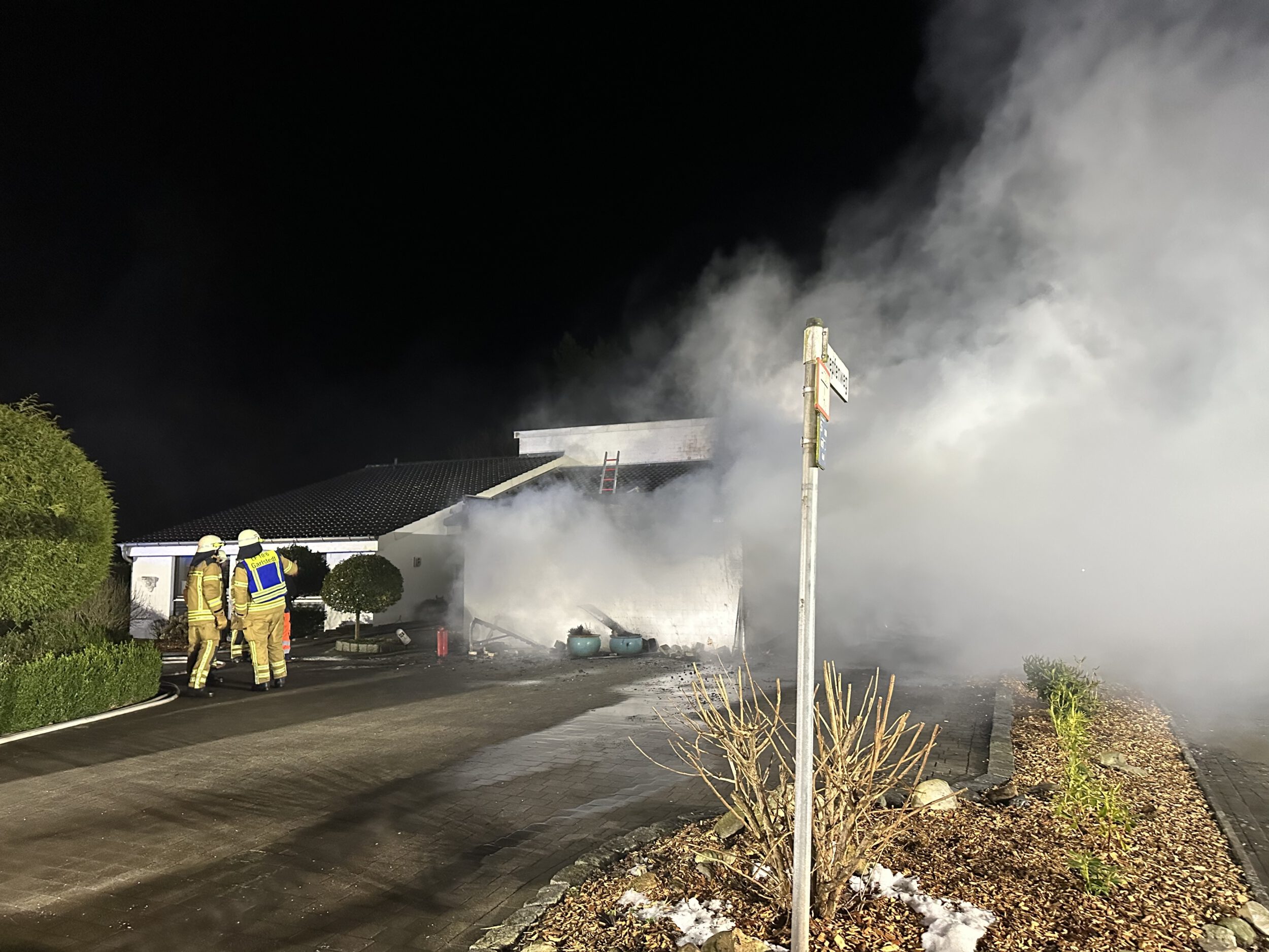 Zwei Personen hatten sich bereits selbstständig aus dem Gebäude gerettet und wurden vom Rettungsdienst betreut. Da sich keine weiteren Personen im Wohnhaus befanden, begannen mehrere Trupps unmittelbar mit der Brandbekämpfung mit mehreren Rohren, sowohl im Innen- als auch im Außenangriff. Außerdem kam der leistungsfähige Frontmonitor des Garlstedter Tanklöschfahrzeuges zum Einsatz. Mit diesem konnte eine große Menge Wasser in das Carport abgegeben und das Feuer eingedämmt werden.