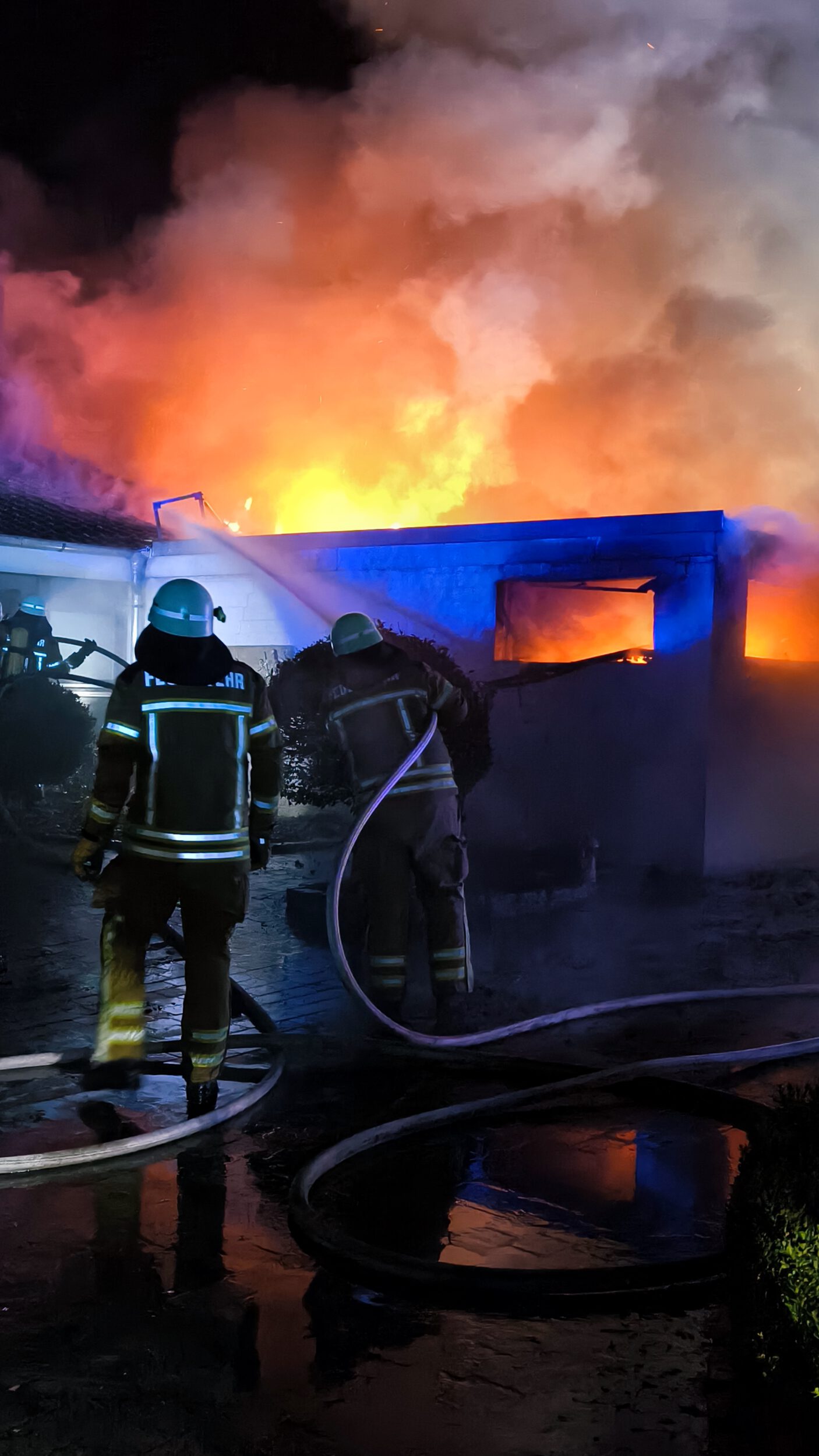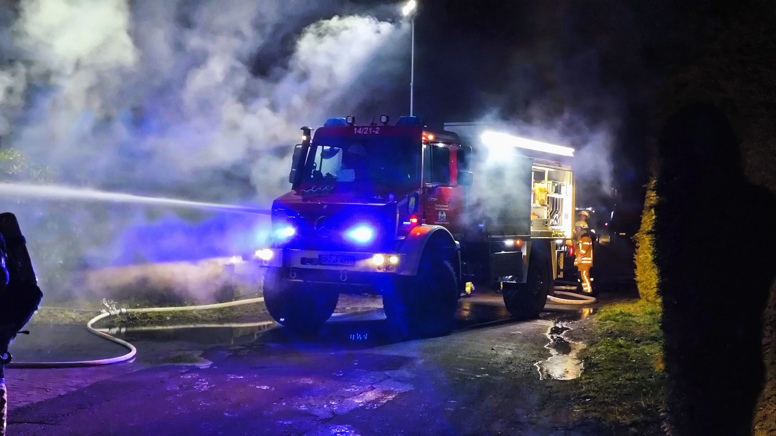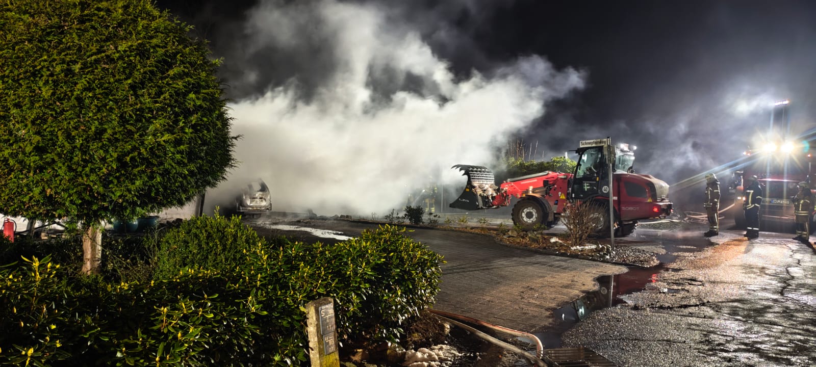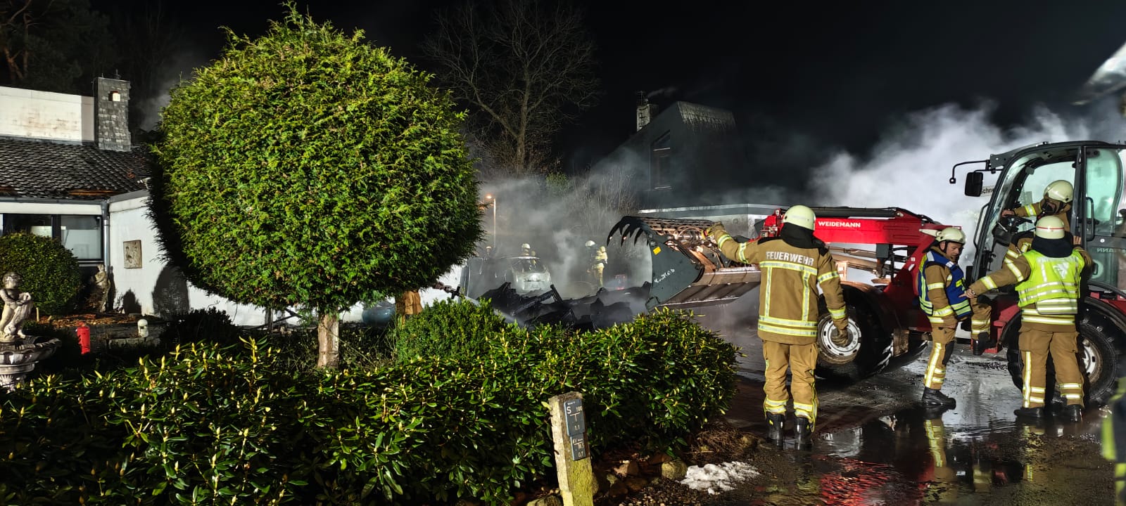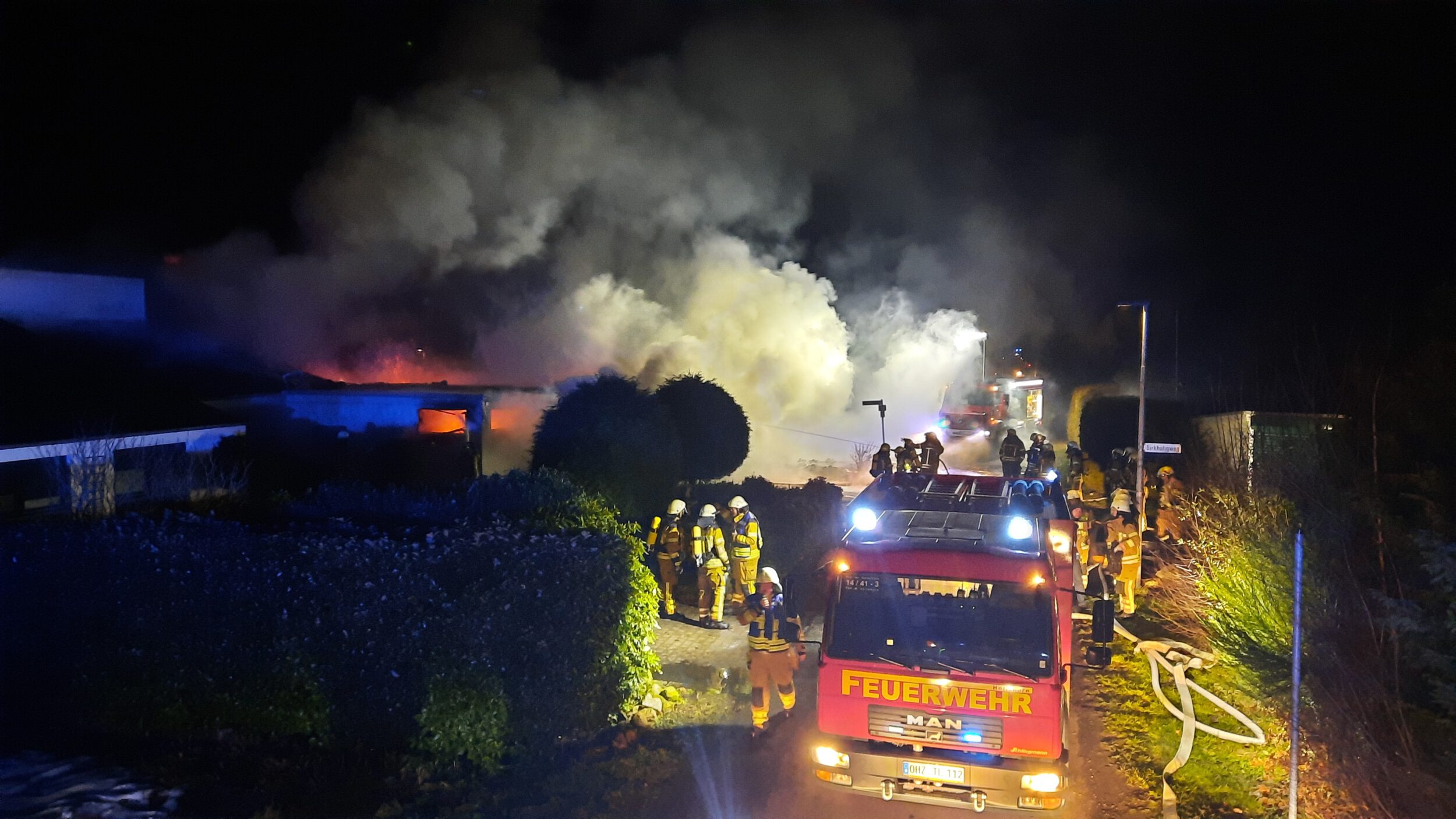 Zwei Personen hatten sich bereits selbstständig aus dem Gebäude gerettet und wurden vom Rettungsdienst betreut. Da sich keine weiteren Personen im Wohnhaus befanden, begannen mehrere Trupps unmittelbar mit der Brandbekämpfung mit mehreren Rohren, sowohl im Innen- als auch im Außenangriff. Außerdem kam der leistungsfähige Frontmonitor des Garlstedter Tanklöschfahrzeuges zum Einsatz. Mit diesem konnte eine große Menge Wasser in das Carport abgegeben und das Feuer eingedämmt werden.