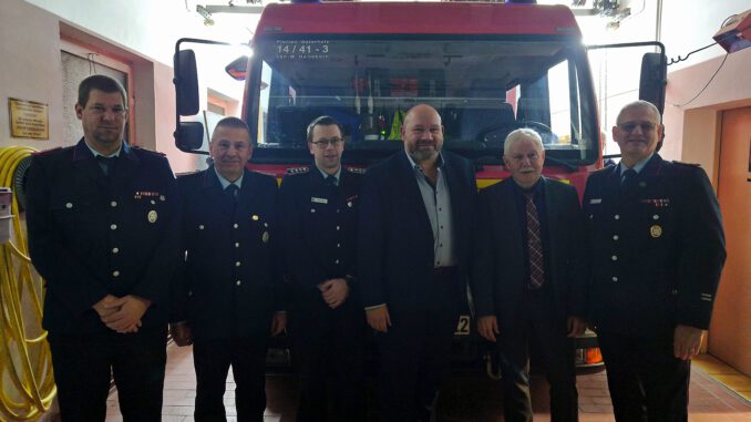 v.L. Stellv. Ortsbrandmeister Dennis Eimann, Ortsbrandmeister Jens Beckmann, Stellv. Ortsbrandmeister Michael Müller, 1.Stadtrat Torsten Haß, Stellv. Bürgermeister Klaus Sass, Stellv. Stadtbrandmeister Michael Dirschauer