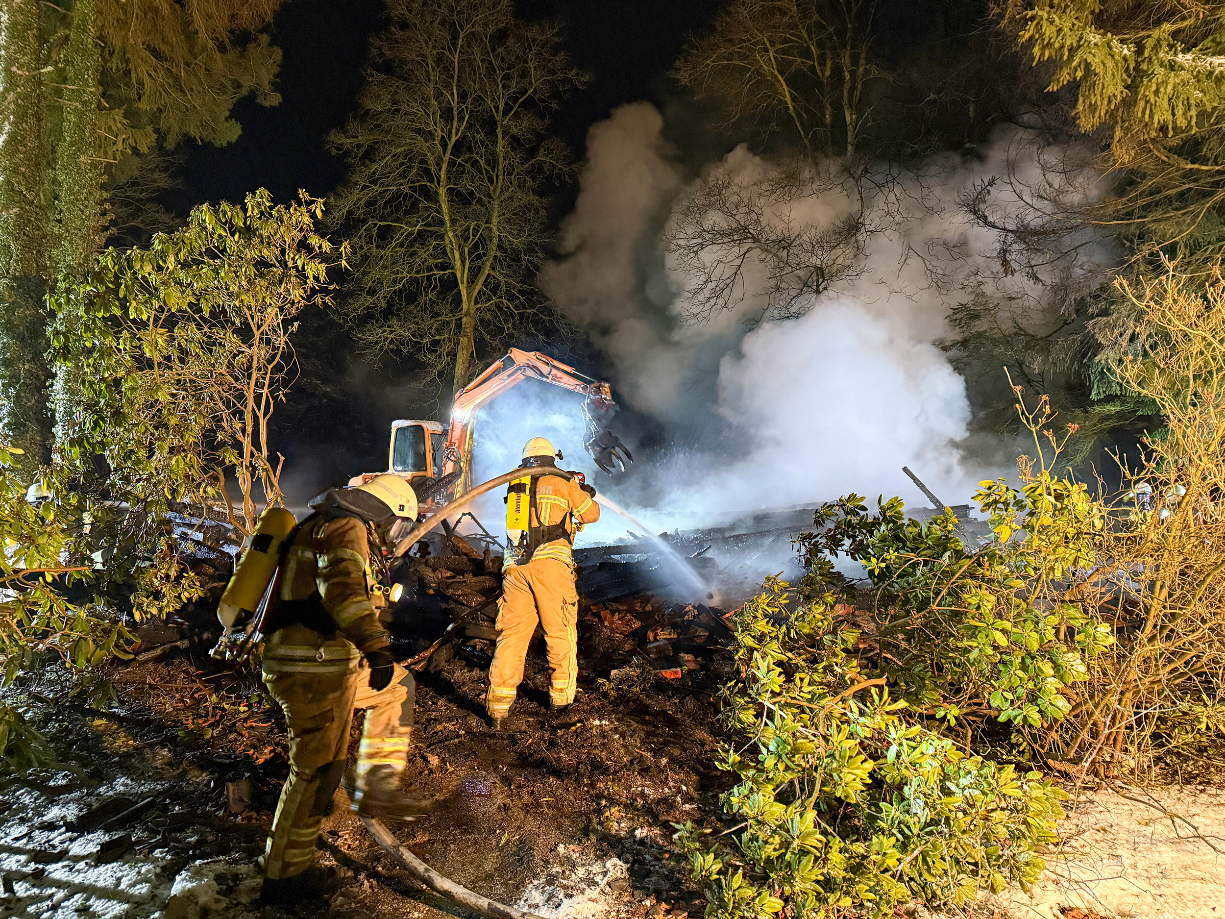 Als die nachrückenden Kräfte eingetroffen waren, konnte mit der Brandbekämpfung und dem weiteren Aufbau der Wasserversorgung begonnen werden. Zur Brandbekämpfung wurde mit zwei C-Rohren und einem B-Rohr vorgegangen, außerdem wurde das Umfeld der Einsatzstelle ausgeleuchtet. Da das Gebäude teilweise bereits zusammengefallen war, kam ein Bagger zum Einsatz um die letzten Glutnester aufzudecken und abzulöschen. Aus Sicherheitsgründen wurde außerdem die Stromversorgung des Gebäudes durch den Energieversorger getrennt.